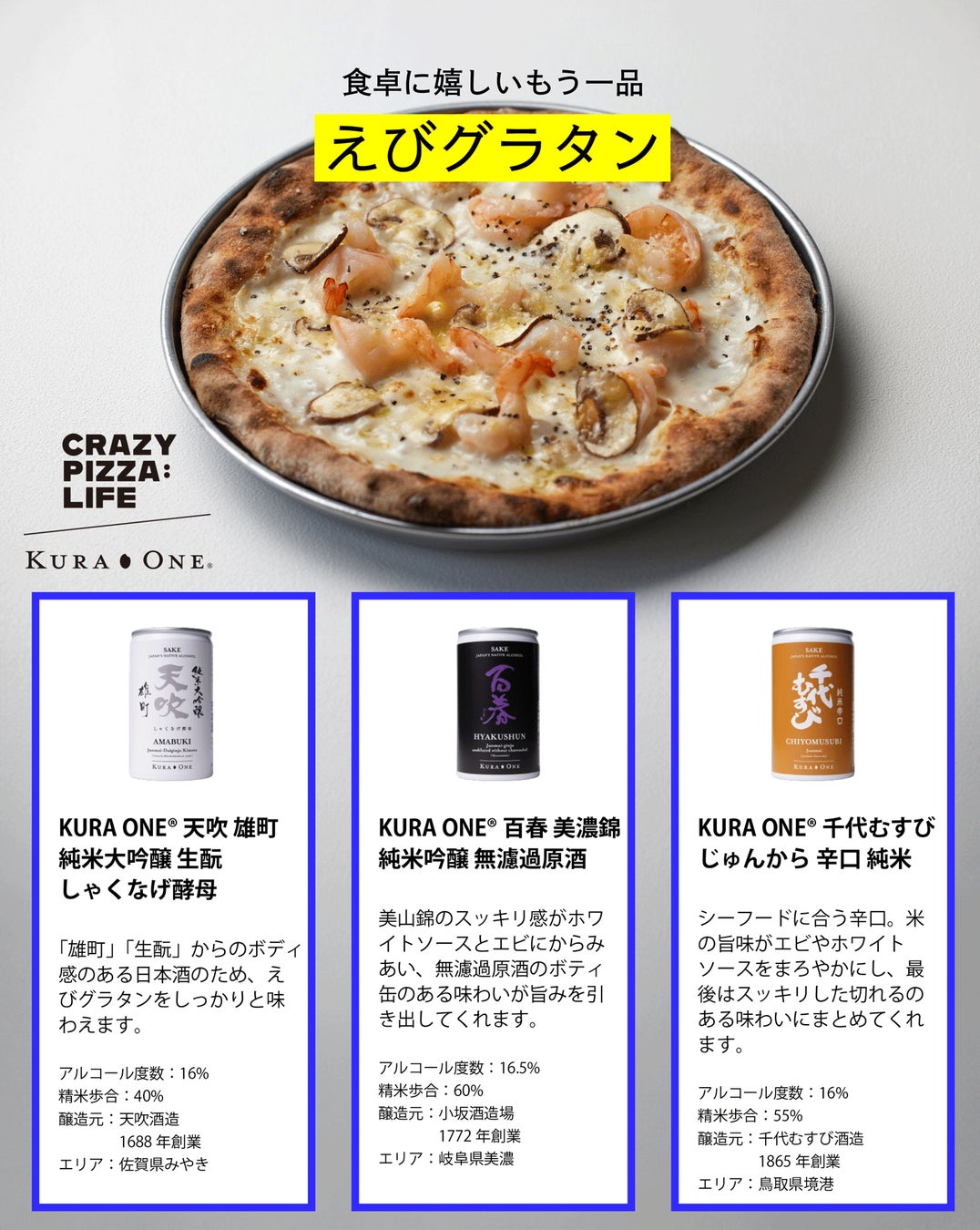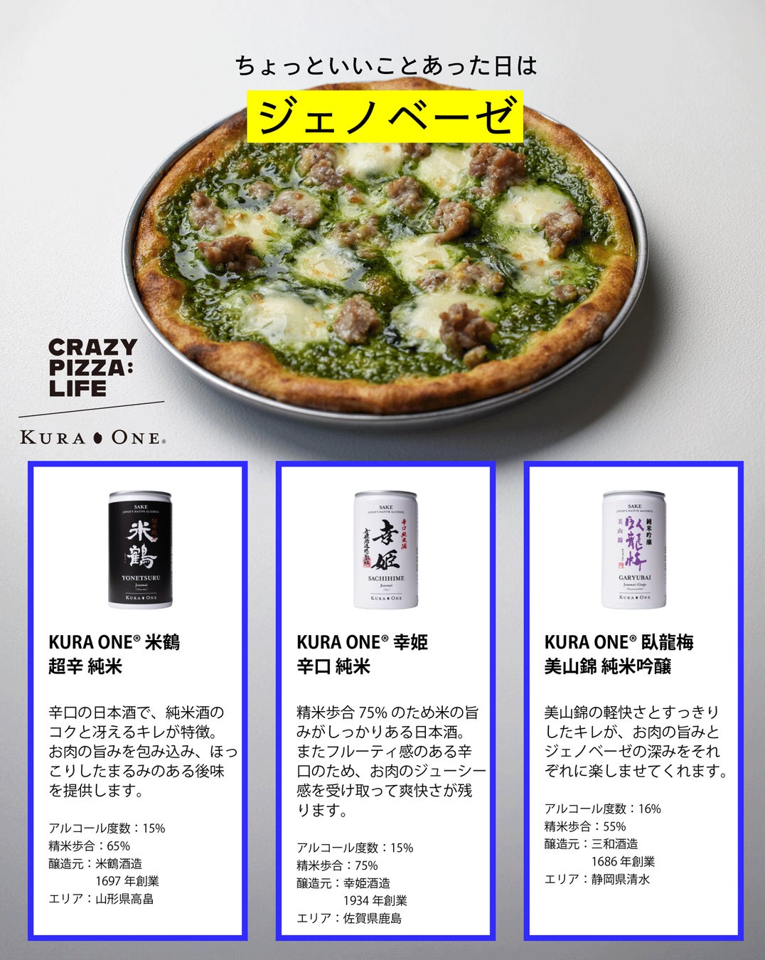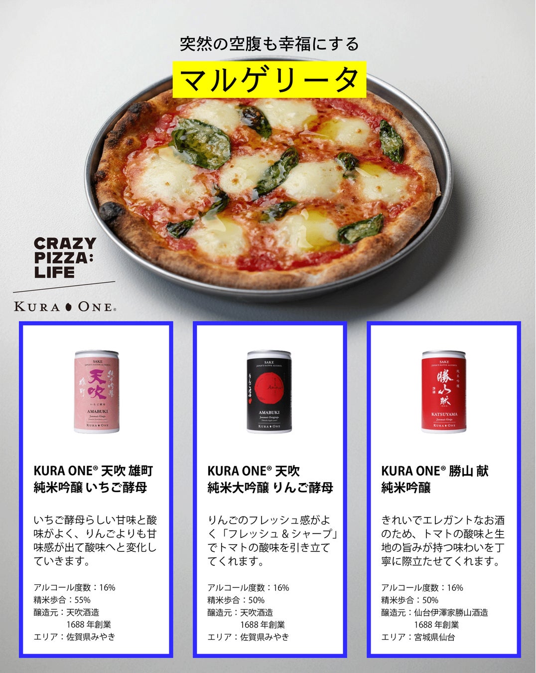 CRAZY PIZZA : LIFEの8種類のピザとKURA ONE®の21銘柄の日本酒をペアリングし、その中から4種類のピザに最も合う日本酒銘柄を厳選しました。