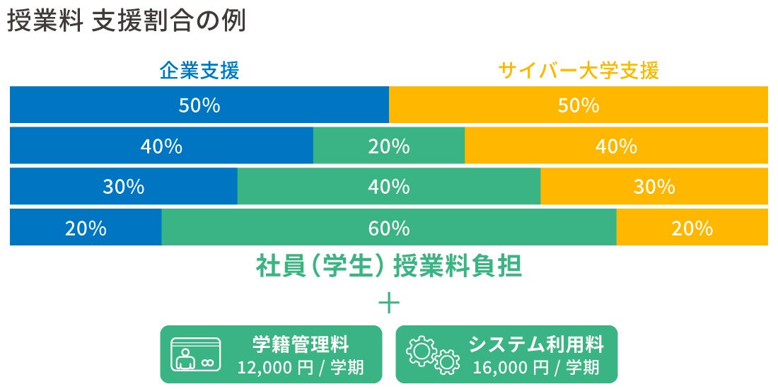 サイバー大学(学長:川原 洋、所在地:福岡市東区、以下「本学」)は、社員の大学進学を支援する企業と連携し、「授業料マッチングファンド」を開始します。それにあたり、連携を希望する企業からの申込受付を本日から開始しました。本取り組みは、連携する企業の社員が本学へ進学する際、授業料の一部を企業と本学が同額ずつ支援することで、社員個人にかかる経済的負担を軽減するものです。社員は働きながら高度なITスキルとDX推進力を身に付け、大卒資格の取得もめざすことが可能となり、多くの社会人の高等教育の機会創出と企業の人的資産経営戦略に貢献します。