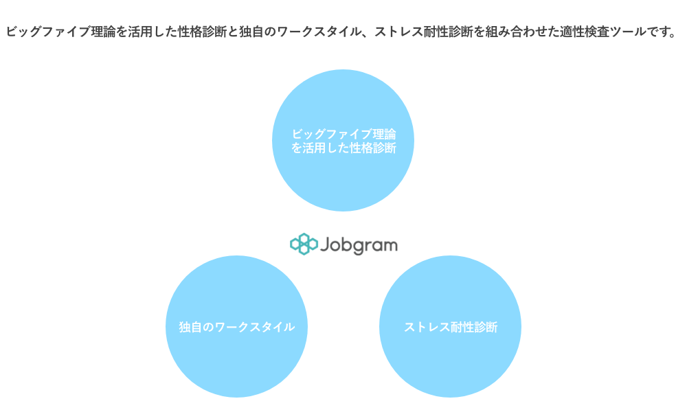 Jobgramは、ビッグファイブ理論を活用した性格診断と独自のワークスタイル、ストレス耐性診断を組み合わせた適性検査ツールです。急成長企業を中心に利用され、様々な性格特性の人がどのようなポジション・役割で活躍しているかのデータを大量に蓄積しています。