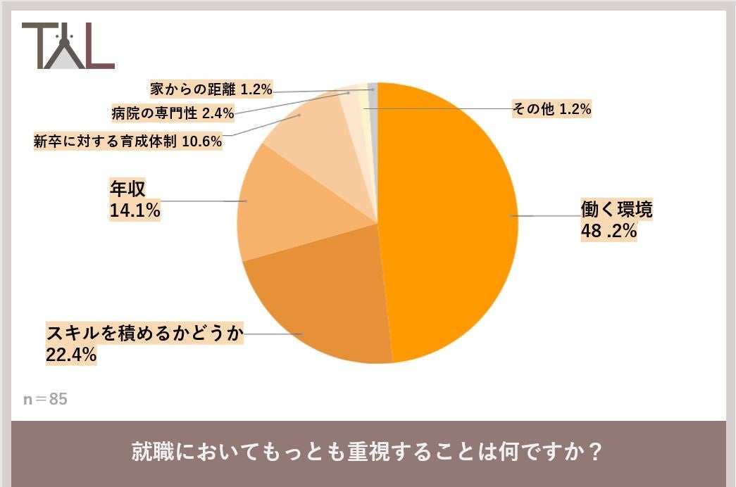 TYLではペット医療DXを推進しており、獣医師・動物看護スタッフなど獣医療に携わる方向けに就職支援をおこなっております。就職支援をするうえで、これから獣医師になる大学生の就職活動における悩みや考えを明らかにするため、獣医学生85名にアンケート調査を実施しました。悩みや考えを明らかにし、これから獣医師になる大学生の就職活動の手助けができればと考えています。