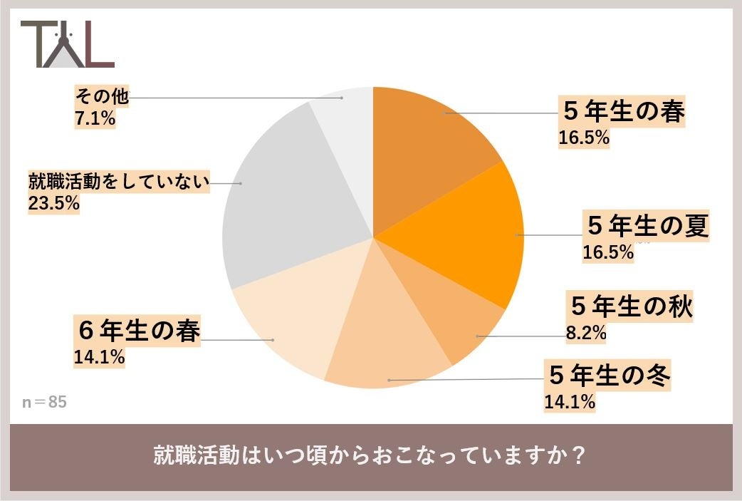 獣医学生85名に対し、「就職活動はいつ頃からおこなっていますか?」という質問に対しては、「5年生の春」が16.5%、「5年生の夏」が16.5%、「5年生の秋」が8.2%、「5年生の冬」が14.1%、「6年生の春」が14.1%、「就職活動をしていない」が23.5%、「その他」が7.1%という結果になりました。