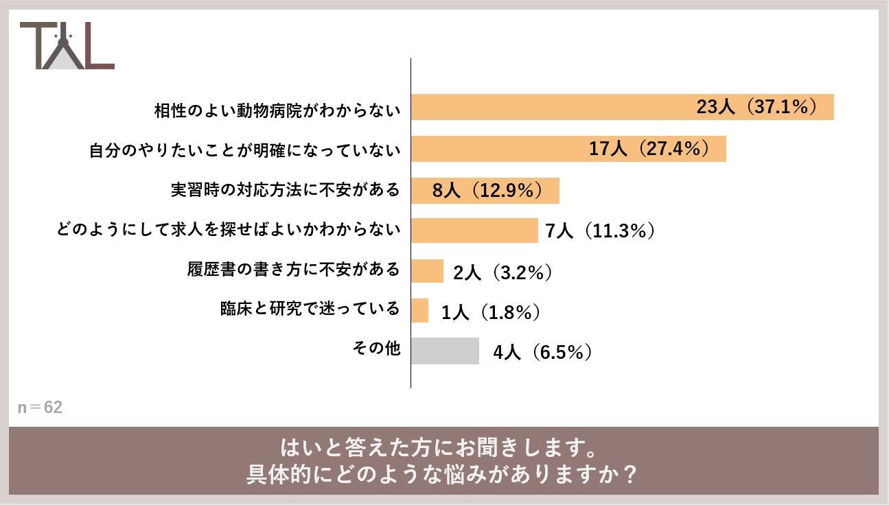 獣医学生85名に対し、「就職活動に関して悩んだことはありますか?」と質問したところ、「はい」と答えた人が72.9%、「いいえ」と答えた人が27.1%という結果でした。「はい」と答えた62人に対し、「具体的にどのような悩みがありますか?」と質問したところ、1位が「相性のよい動物病院がわからない」で37.1%、2位が「自分のやりたいことが明確になっていない」で27.4%、3位が「実習時の対応方法に不安がある」で12.9%という結果になりました。