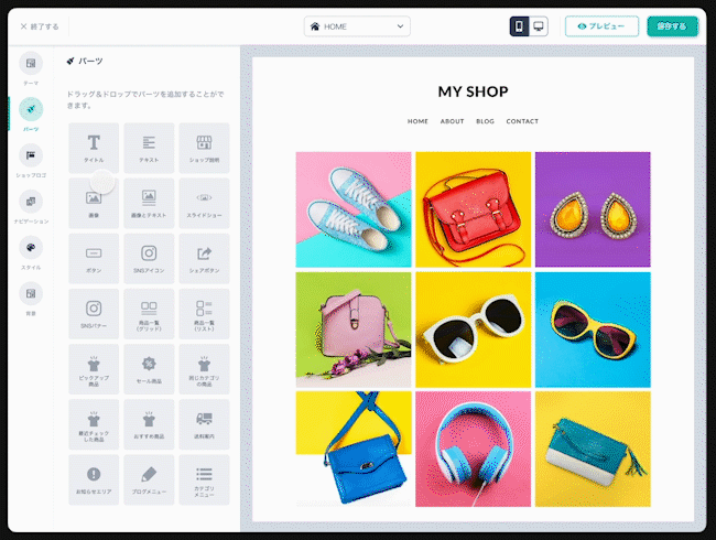 この度の大幅リニューアルでは、無料で利用できる新しい17種類のオフィシャルテーマを提供するほか、これまでは編集できなかったスライドショーの追加や、商品のピックアップ表示など、20種類以上のパーツを希望する位置に簡易に設定できるようになりました。特別なスキルは一切必要ありません。