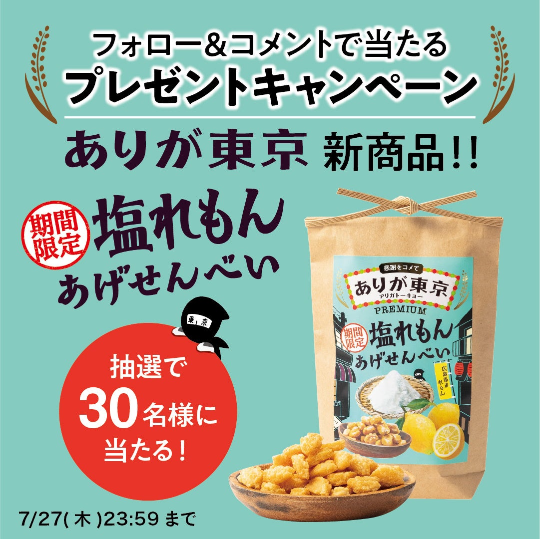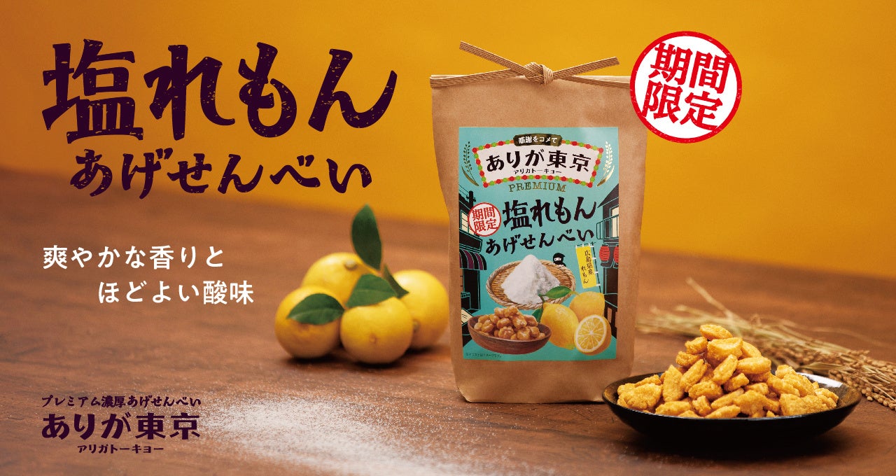 株式会社吉村(東京都品川区、代表:橋本久美子)は、「ありがとうを伝える東京みやげ」をコンセプトにしたブランド、プレミアムあげせんべい「ありが東京」より、 期間限定の新商品「塩れもん味」を全国発売いたします。お取扱店のほか、首都圏で開催されるポップアップショップ、公式オンラインストアでも販売いたします。