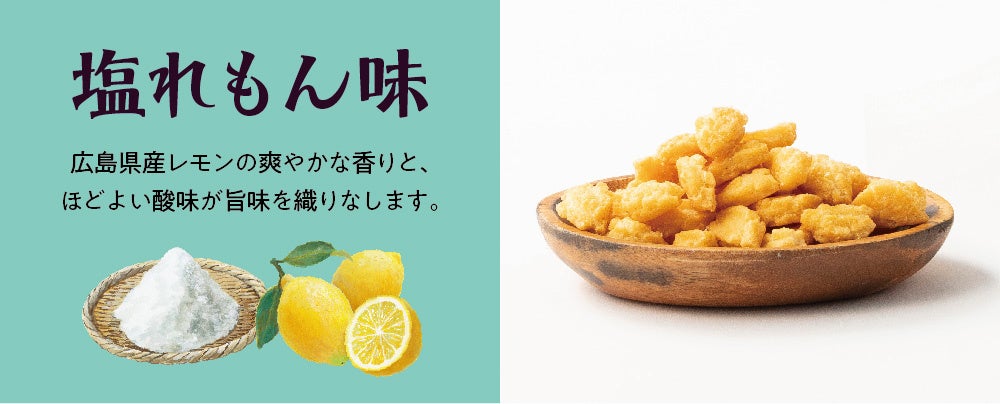 今回発売開始するのは、季節限定「塩れもん味」です。広島県産レモンの爽やかな香りとほどよい酸味が楽しめる、夏にぴったりの商品です。帰省の手土産に、夏の贈りものにぜひご活用ください。