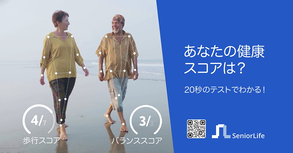 高齢者を対象に独自のAIアルゴリズム、コンピュータビジョン、暗号化技術を活用し、歩行における障害や膝の曲げ伸ばしの状態、バランスや重心障害などのMSK障害を検出し、問題点に対してのトレーニング等のアドバイスを行います。また数カ月後に再テストを行い、健康スコアが改善されたか確認することができます。