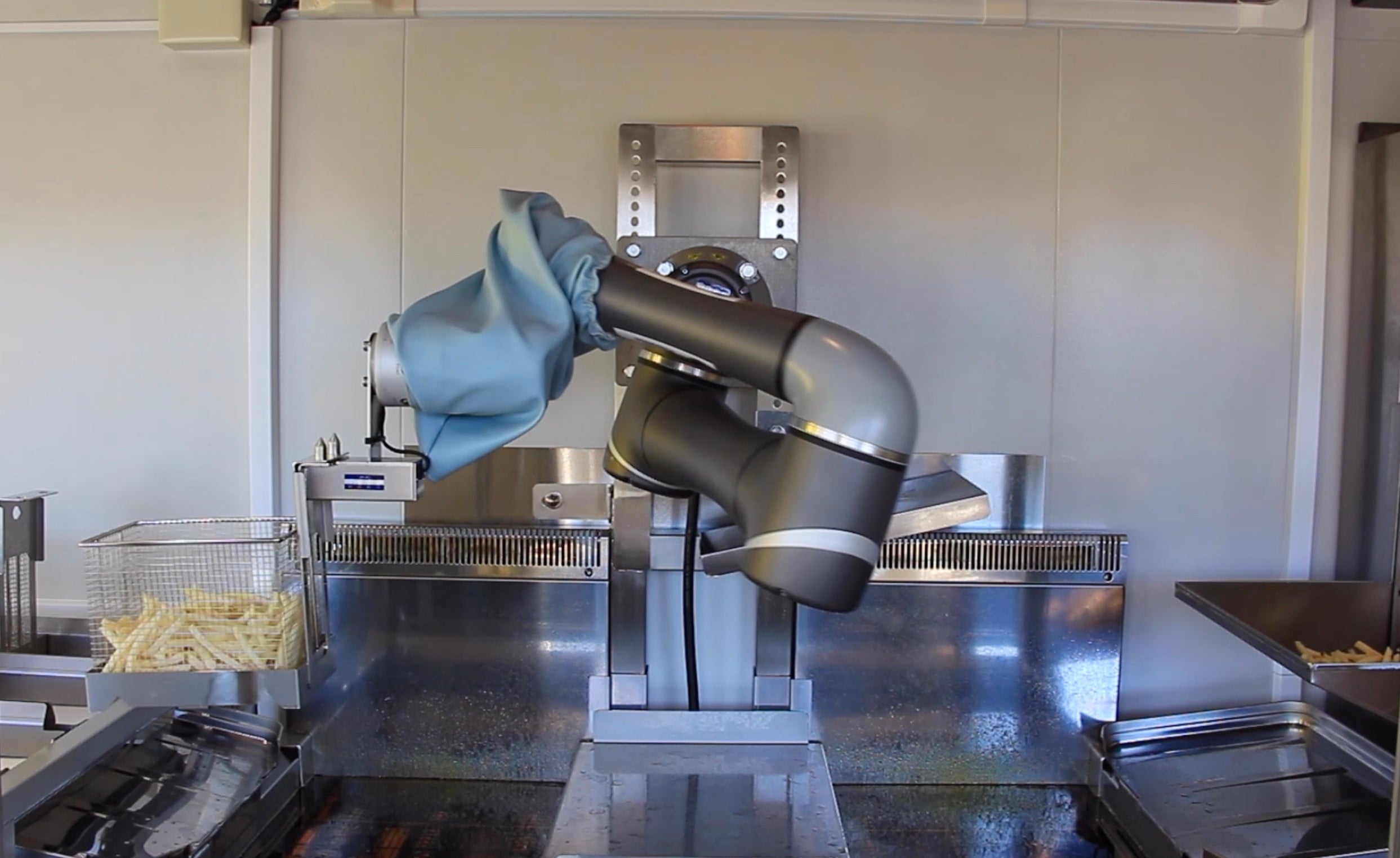 フライドポテトロボットは一定量のポテトを自動で油に投入して揚げ、一定時間が来るとバギングステーションに移動させる工程を自動化できます。ロボットに任せることで、フライヤーの前に立ち続ける事が無く、安定したフライドポテトを作ることができます。