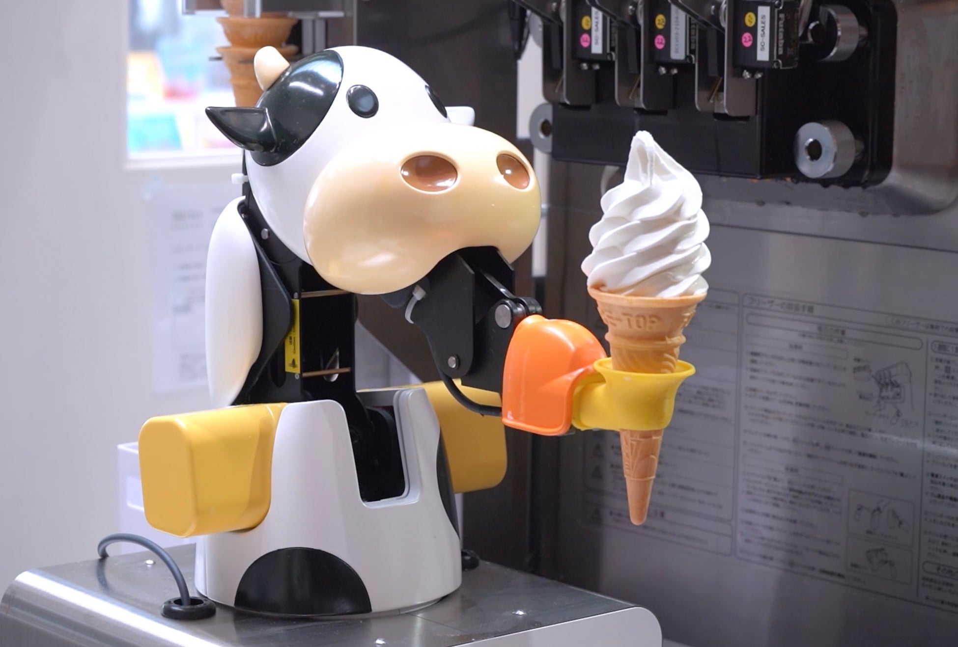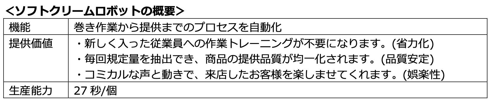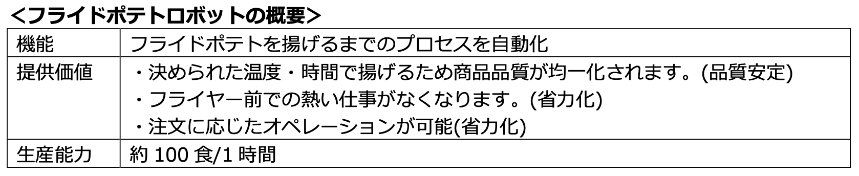 フライドポテトをロボットが自動で投入し、フライドポテトを揚げ、バギングステーションに移動させるまでの一連のオペレーションを自動化しました。また、自動でソフトクリームを巻いてくれるソフトクリームロボットも実演展示します。接触頻度を軽減するとともに、身近にロボットを感じてもらうことができ、ファミリー層の集客や話題作りから、実際の生産性向上にもつながることができるロボットをご紹介します。
