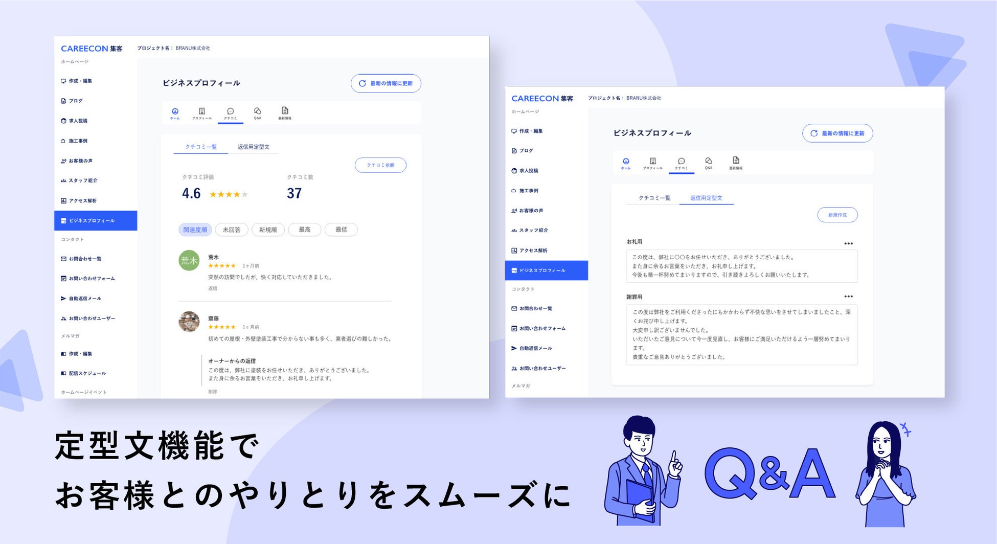 お客様が投稿したクチコミやQ&Aに対しての回答も行えます。クチコミに返信する際は、よく使う文章の雛形をあらかじめ登録できる定型文機能を用意。これによりスムーズな返信が可能となります。