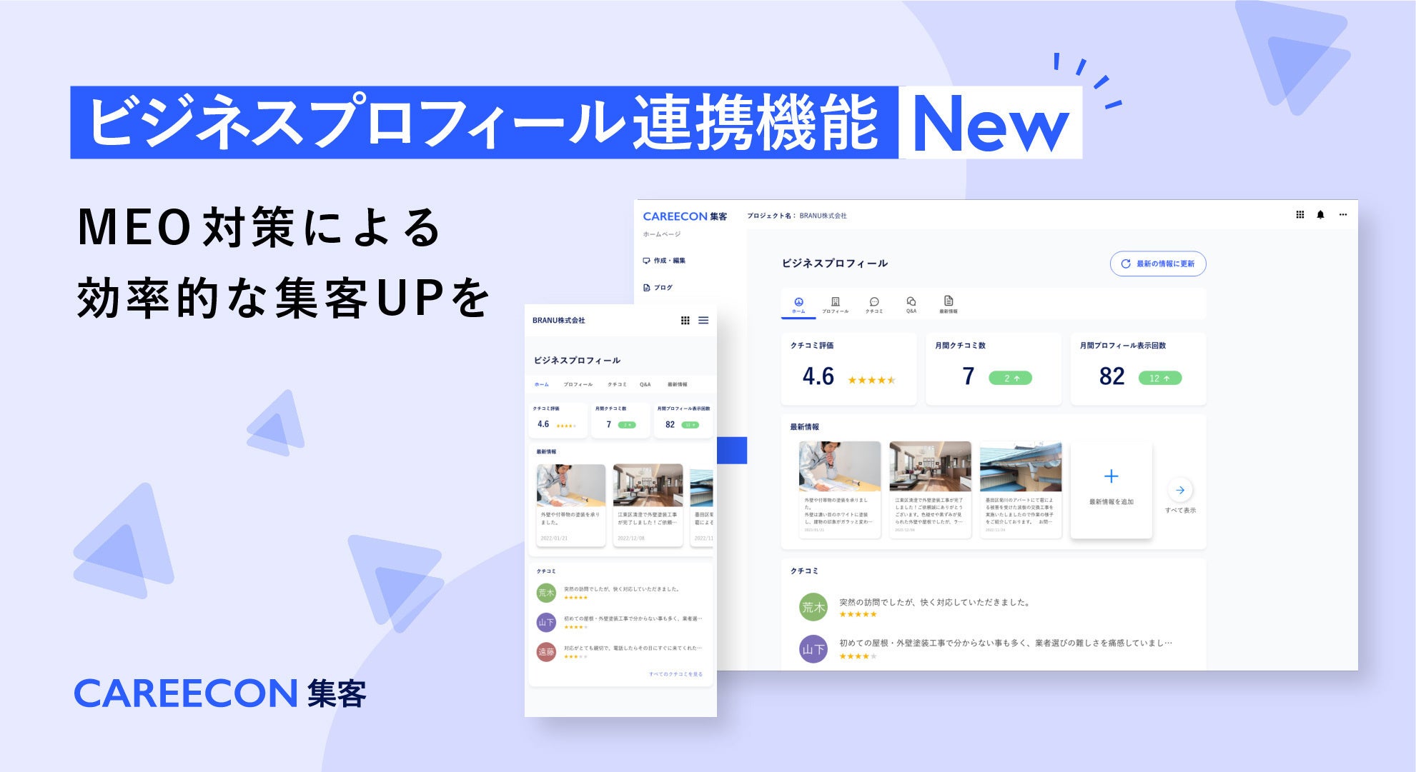 建設業界のDX(デジタルトランスフォーメーション)を目指すBRANU株式会社(本社:東京都港区 / 代表取締役CEO:名富達哉 / 以下ブラニュー)は、建設中小企業向けデジタルマーケティングツール「CAREECON 集客」に、MEO(マップエンジン最適化)対策を通じてローカルビジネスのDXを推進できるビジネスプロフィール連携機能をリリース。2023年2月22日より提供を開始しました。