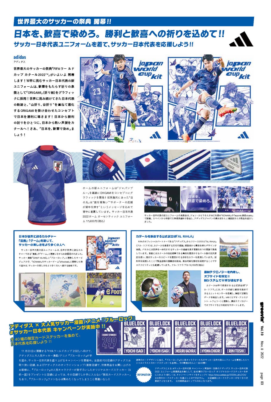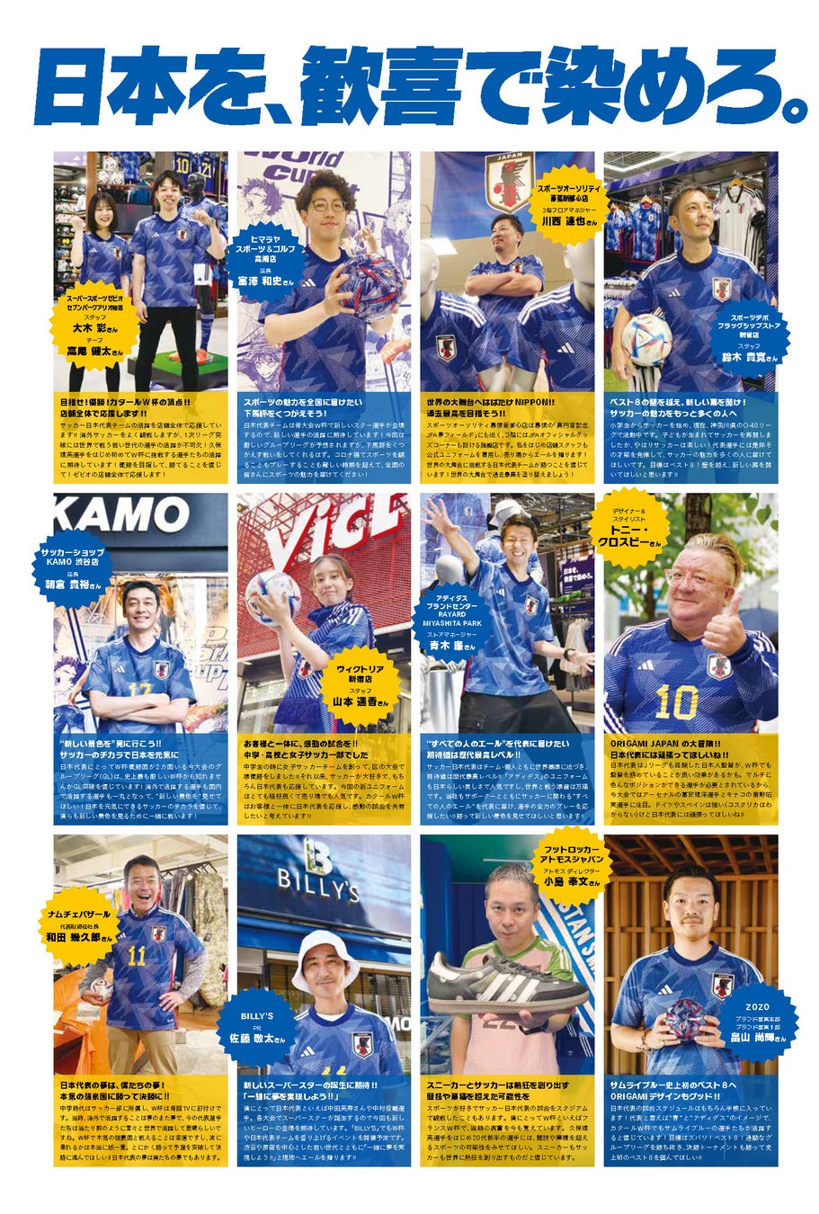 「アディダス」による最新のサッカー日本代表ユニフォームの詳細や、W杯の公式試合球、サッカースパイクの最新コレクションをはじめ、「サッカー日本代表を応援する人々からの応援メッセージ」や、「桜や和菓子など日本文化から着用を得た サッカー日本代表 スペシャルコレクション」、フットロッカーアトモスジャパンの小島奉文ディレクターのスペシャルインタビュー「スニーカーとサッカーは世界を熱狂させる」などを掲載しています。