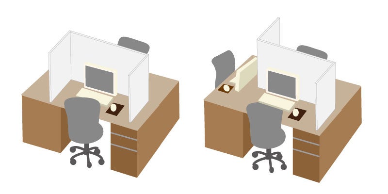 「ココスペースプラス」は、形を自由に変えられることも大きな特徴です。コの字タイプ(下図の左)・S字タイプ(下図の右)の2種類に形を変えることが可能なので、形を変えて複数人で使用することができます。