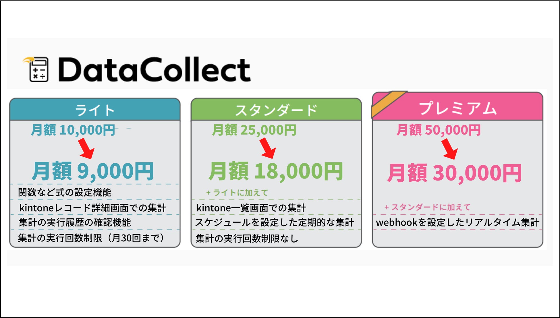 そして、今までよりも多くのお客様の生産性向上になればと考え、利用料金の値下げを実施いたしました。ステータス管理やデータ更新作業なども自動化できる最上位コースのプレミアムコースでは、月額50,000円(税別)から月額30,000円(税別)と、40%ディスカウントでの提供となります。