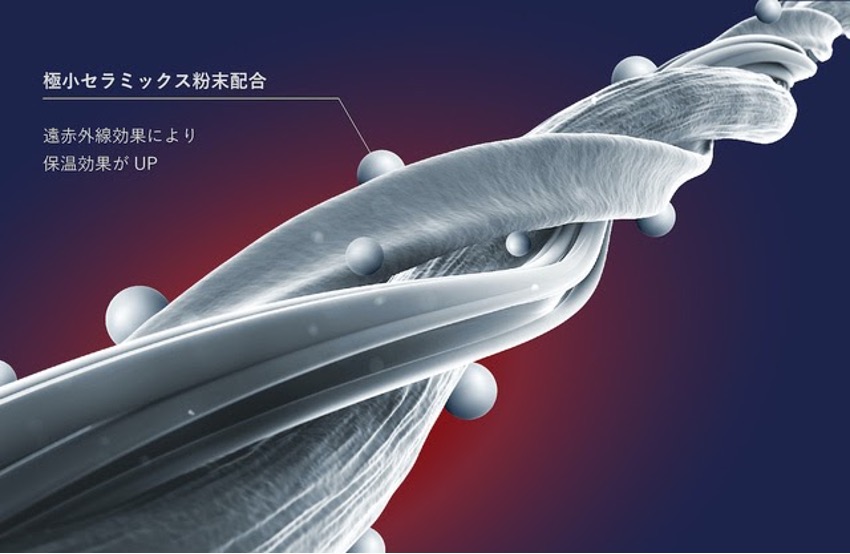 繊維原料に極小セラミックスの粉末を配合し、特殊紡績することで、体温を蓄熱保温する効果を実現させました。身体から放射される円赤外線をSELFLAME繊維が吸収し、熱に変換。その熱を再び身体へ身体へ跳ね返しすことで体温に近い温度を保つことができます。