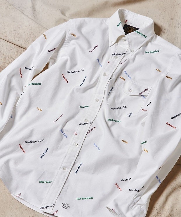 商品詳細:『J.PRESS』の代表的なアイテムであるアービングボタンダウンの仕様や素材を採用しています。過去から現在に至るまでの『J.PRESS』の店舗が存在した都市名を総柄で刺繍をほどこしたヴィンテージオックスを使用した120周年記念アイテムです。