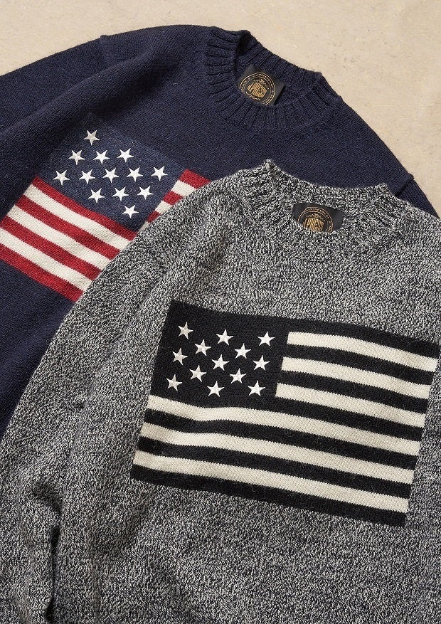 商品詳細:クルーネックのプルオーバー型のウールニットです。英国で200年以上の歴史のある紡績工場で作られた英国羊毛を使用しており、糸に膨らみを持たせる梳毛紡績独特のハリと膨らみが特徴です。ニットにはインターシャによるアメリカンフラッグが施されています。軽くて温かいアニバーサリーにぴったりなアイテムです。