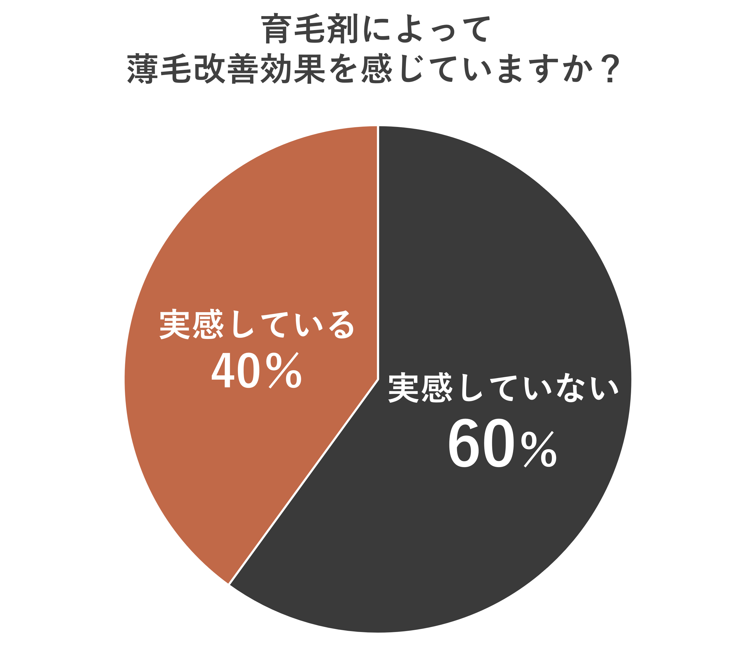 一方で、「現在実施している取り組みにより効果を実感していますか?」という質問をしたところ、前述の質問で「頭皮マッサージ」と回答した人のうち約9割が、「育毛剤」と回答した人のうち約6割の人が、「効果を実感できていない」と答えました。手軽さから自宅でできる薄毛対策が人気であることが浮き彫りとなった一方、そのような対策では満足に効果実感できず、物足りなさを感じている人が多いことが分かりました。