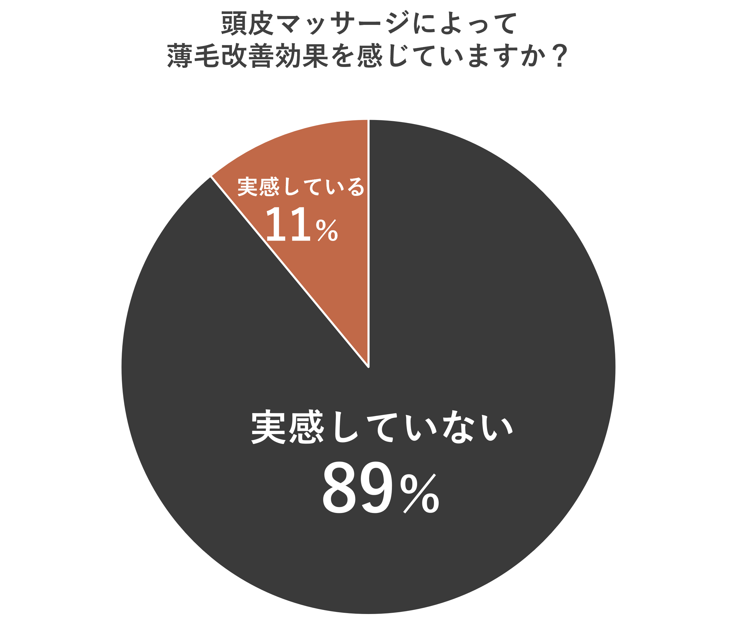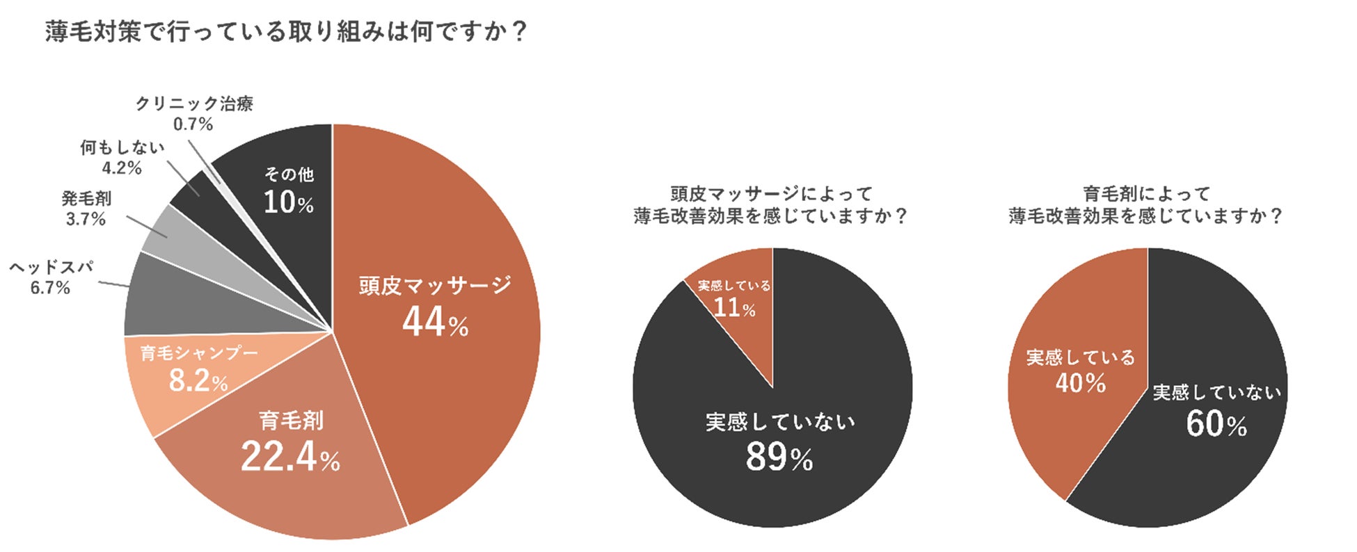 また、薄毛対策として実施していること第一位は「頭皮マッサージ」しかし、そのうち約9割は「効果を実感できていない」という結果に