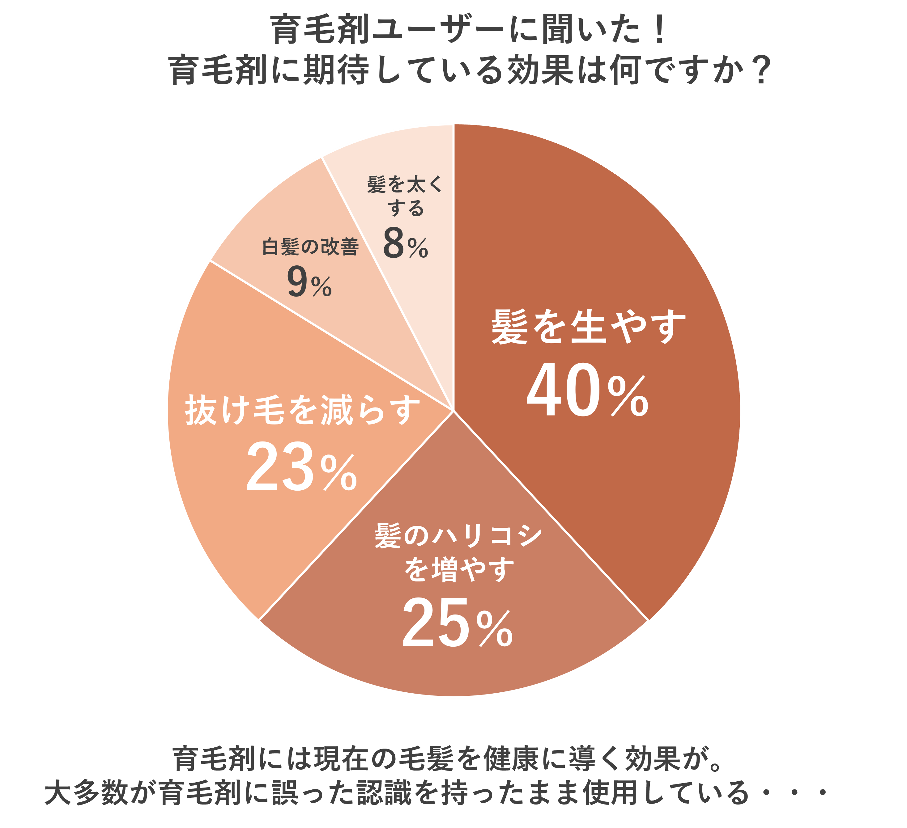 育毛剤を使用している方に対して、「育毛剤に期待している効果は?」と質問をしたところ、約4割の方が「髪を生やす」と回答し、一部のユーザーにおいては誤った認識を持って育毛剤を使用していることが分かりました。