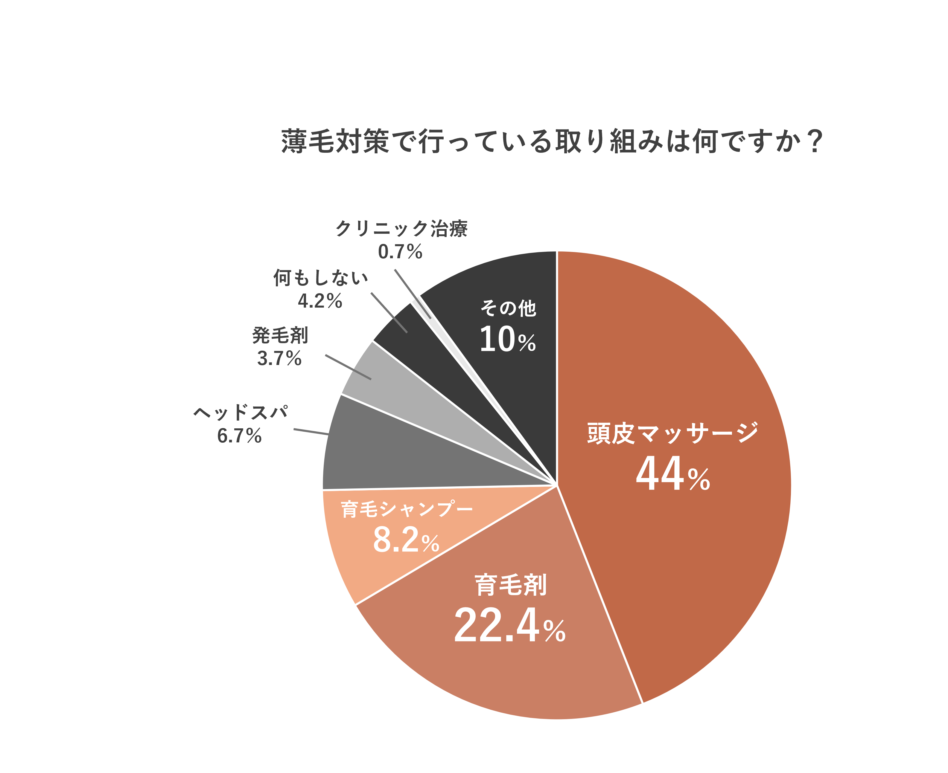 「薄毛対策として行っている取り組みは何ですか?」という質問に対しては、約4割の人が「頭皮マッサージ」と回答し、第一位となりました。次いで、約3割の人が「育毛剤」と回答し、第二位となりました。