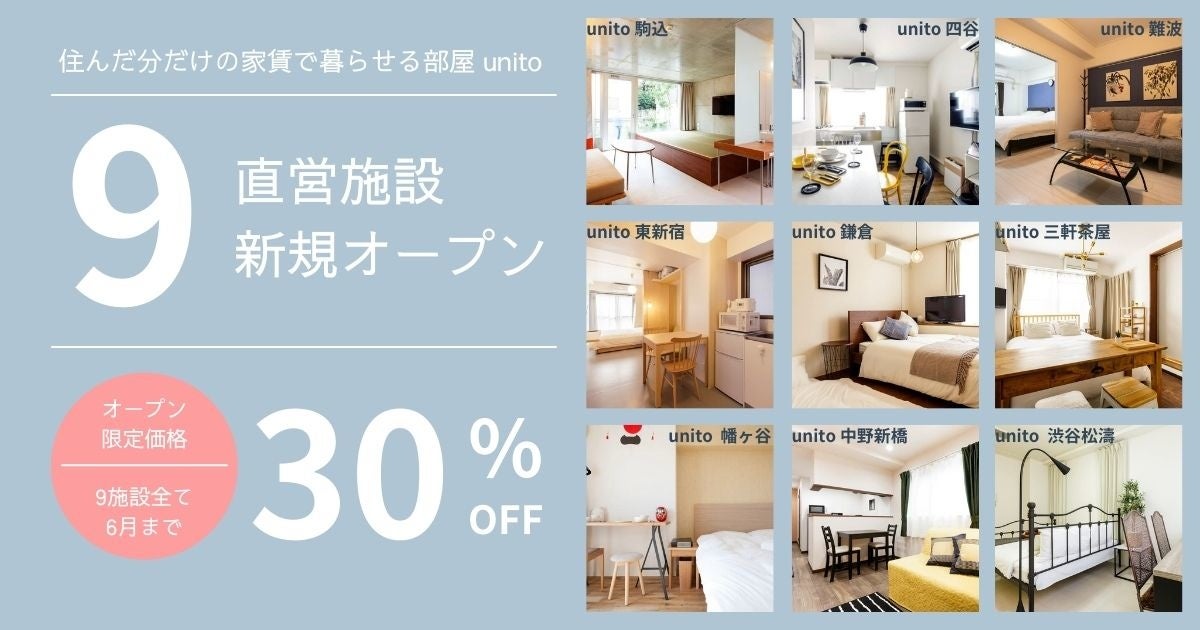 住んだ分だけの家賃で暮らせる部屋「unito」を提供する株式会社Unito(東京都千代田区、代表取締役:近藤佑太朗、以下ユニット)は、ユニットが直営する施設を新たに9施設21室オープンいたします。