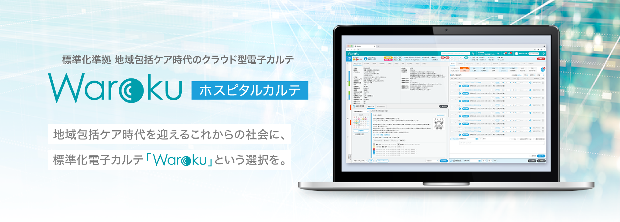弊社製品Warokuは地域で利用できる「共同利用型電子カルテ」を目指して、現在も開発を進めております。人口減少と超少子高齢化によって我が国の社会保障制度における持続可能性が問われる時代となり、地域の事情を踏まえた社会リソースの最適配置と効率的なサービス提供体制が求められる今、オーダリングシステムという業務システムから機能拡張してきた従来の「電子カルテシステム」はその役割を終えたと考えております。