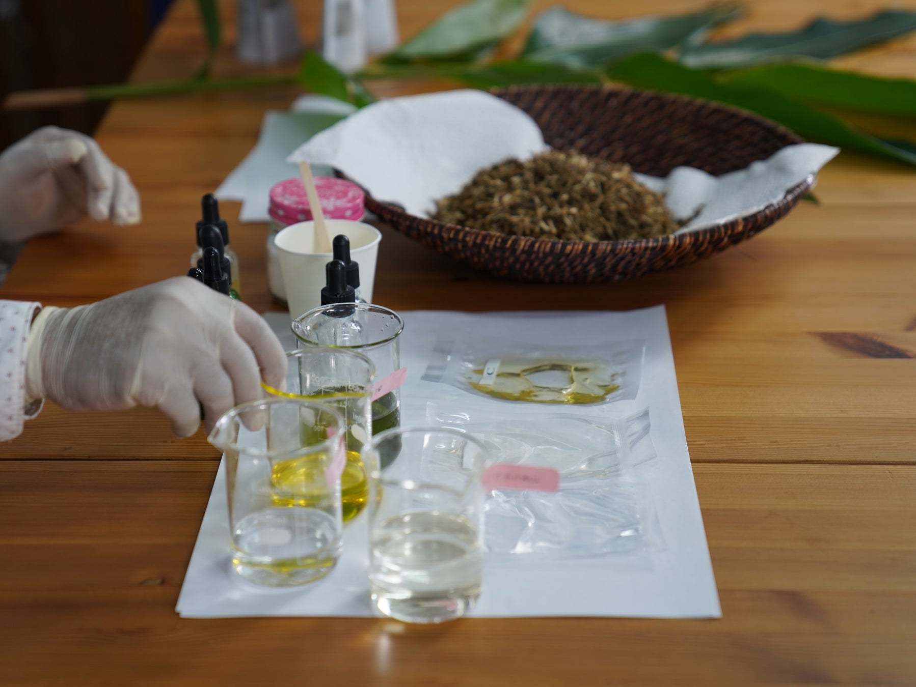 鹿児島県産のタンカンを原料とした水とツバキ・ホホバ・ヒマワリを混ぜたオイルで作る100%天然由来の二層式オイル作りを体験できます。さらに今回は、柑橘系やフラワー系など10種類以上の中からお好きな香りをお選びいただけます。