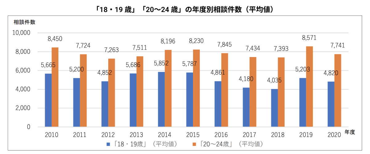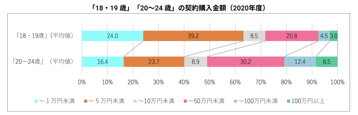 成人年齢引き下げ前に国民生活センターが発表した消費者トラブルの統計によると、相談件数は「18・19歳」よりも「20〜24歳」が約1.5倍となっています。さらに、平均契約購入金額は「18・19歳」が15.8 万円に対し、「20〜24歳」は2.6倍の41.7 万円となっています。消費者トラブル相談件数や契約購入金額は、成人になったばかりの年代で増加する傾向があります。4月から成人になった18・19歳の方を狙い、悪質な契約の勧誘が増加する可能性があります。