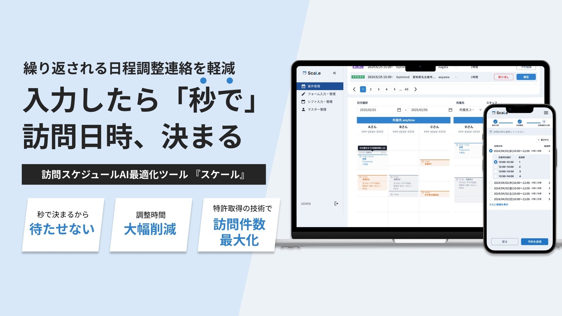 ScaLe(スケール)は、物流とは異なり、人がサービス提供しに出向く産業に対して、最適化AIによって最適な訪問計画を提示することで、「訪問スタッフの余剰稼働を減らす」また「スタッフ稼働効率を上げる」といった効果発揮を支援します。そして、お客様との日時確定までのリードタイムも大幅に短縮でき、離脱率の低下や、「顧客満足度の向上」にも貢献します。