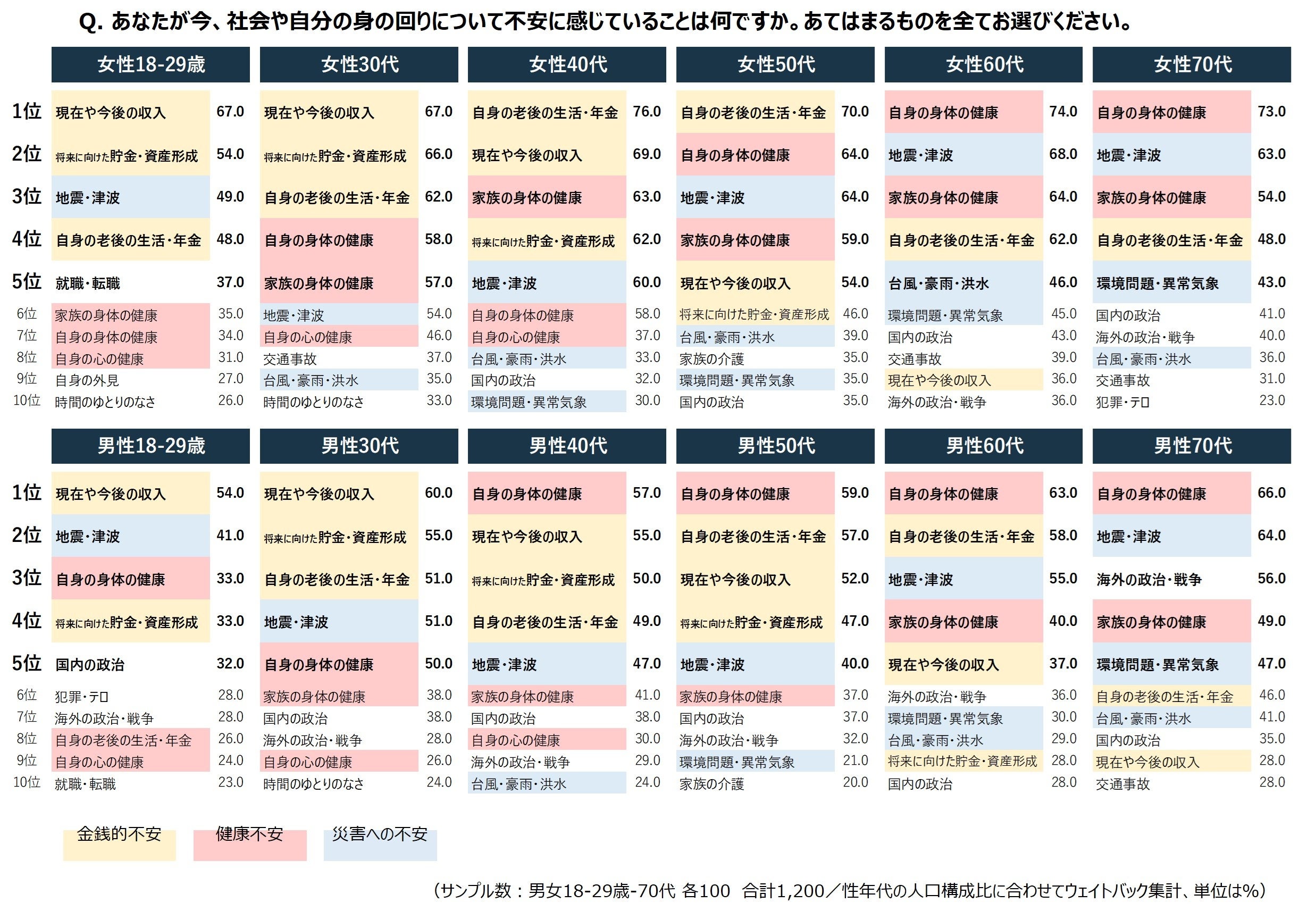 2024年度の大きな特徴としては「経済面に対しての不安が大きくみられた」ことで、60代女性を除いたすべての年代が「経済面の不安」を1位にあげました。