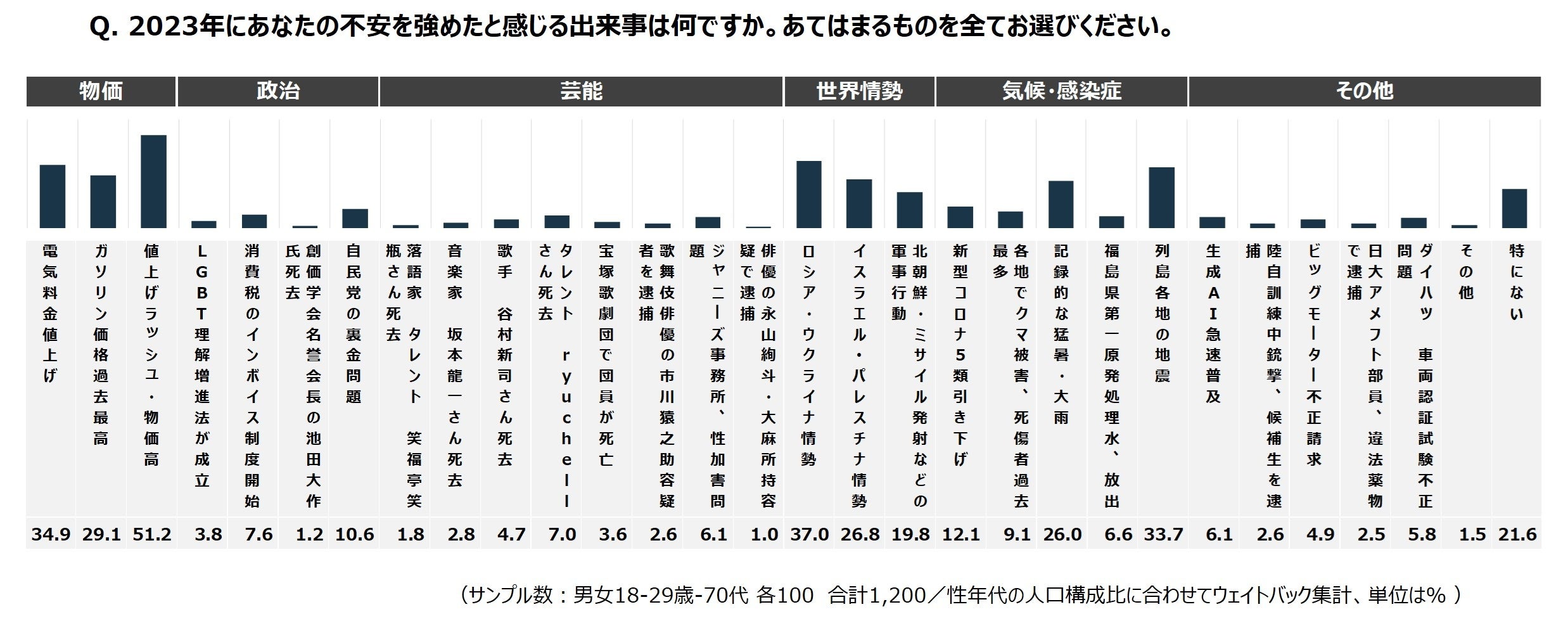Q. あなたが今、社会や自分の身の回りについて不安に感じていることは何ですか。あてはまるものを全てお選びください。
