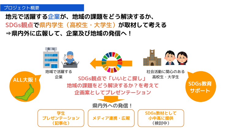 本プロジェクトでは、社会活動に関心のある近畿大学附属高等学校の生徒が、地元で活躍する企業を取材し、SDGsの観点で地域の課題をどのように解決できるかを考え、企画を立案してプレゼンテーションを行います。当日は高校生が8チームに分かれてプレゼンテーションを行い、取材にご協力いただいた企業様をはじめとする審査員がフィードバックや表彰を行います。