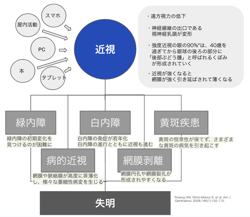 近視は、2050年には、世界の約半数の人が陥ると予測されている疾患です(*1)。特に、日本を含む、中国、香港、台湾、韓国、シンガポールといったアジア諸国で近視が急激に増加しており、ソウルでは、19 歳の男性の96.5%が近視というデータも示されています(*2)。また、2019 年3月に文部科学省が発表した学校保健統計調査によると、小学生〜高校生の裸眼視力における 1.0 以上の割合が過去最低になったと発表されています(*3)。近視の進行により、緑内障視野障害、白内障、網膜剥離、黄斑変性などの疾患を合併するリスクが高まることも知られており(*4)、 強度近視患者の増加は、大きな社会課題の一つですが、未だ本邦で薬事承認を受けた治療法はありません。