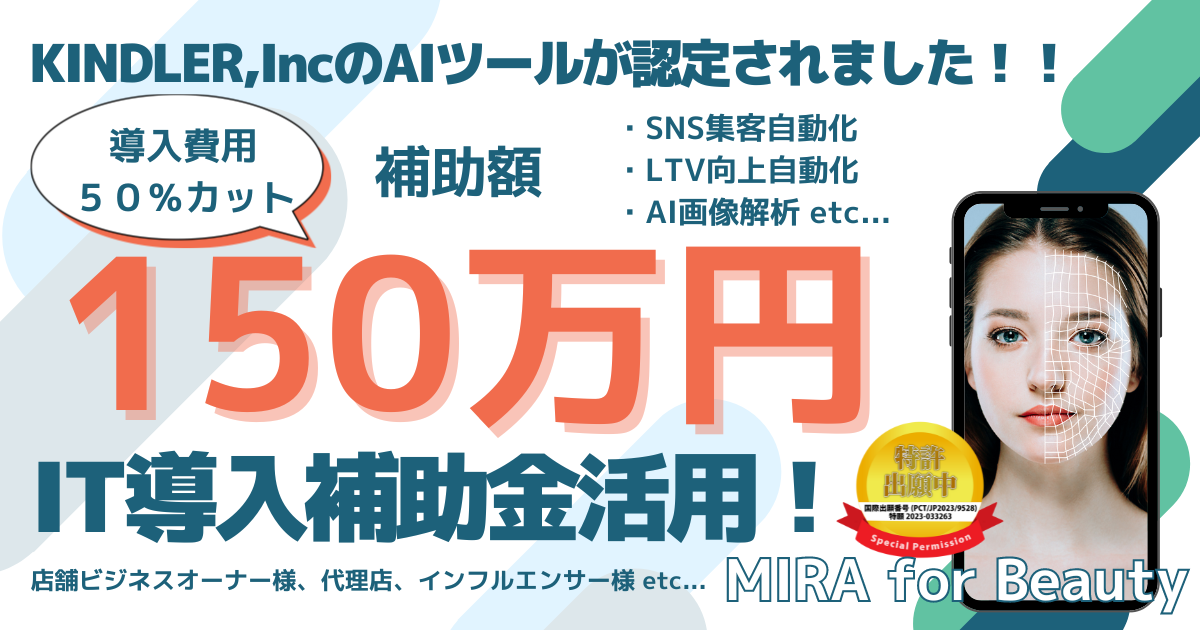 IT導入補助金を利用することで、導入費用が通常の50%削減(上限額150万円)されます。 これにより、新しいテクノロジーを導入する際の経済的なハードルが低減され、多くの事業者が「MIRA for Beauty」を導入しやすくなりました。