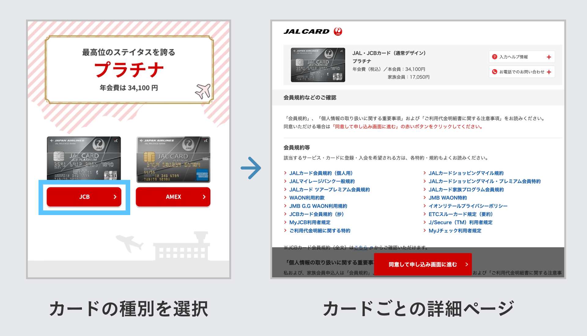 動画内のCTAから、各カードの詳細ページへとシームレスに遷移し、入会へ導く。