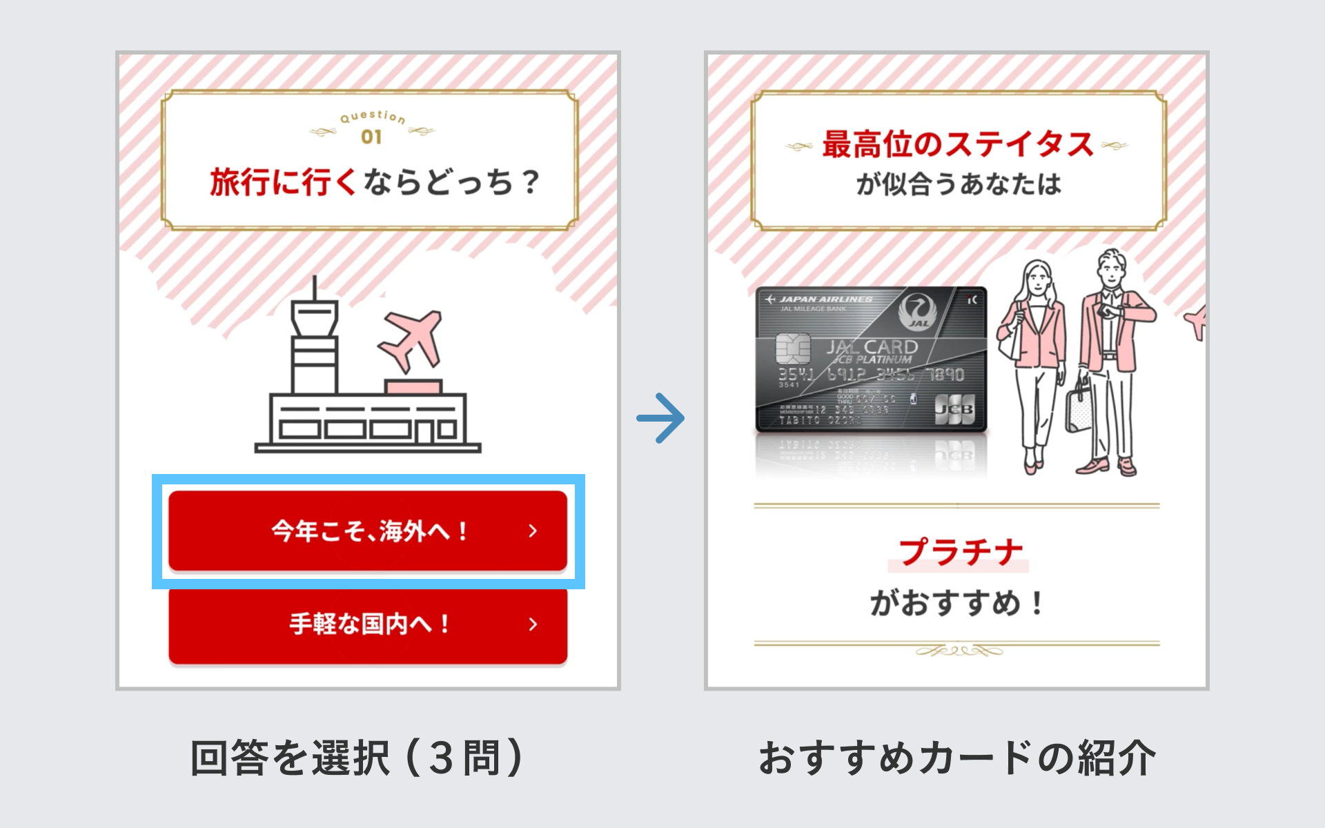 ユーザーが自ら指定した項目に遷移して、それぞれに最適な動画を視聴いただける機能です。この機能により、ユーザーは自身の必要とする情報がすぐに入手できるようになり、満足度を高めるとともに動画からの離脱を防止します。ジャルカード社では診断型で3問の回答結果に応じて「おすすめカード」を紹介し、カード選びをサポートしています。