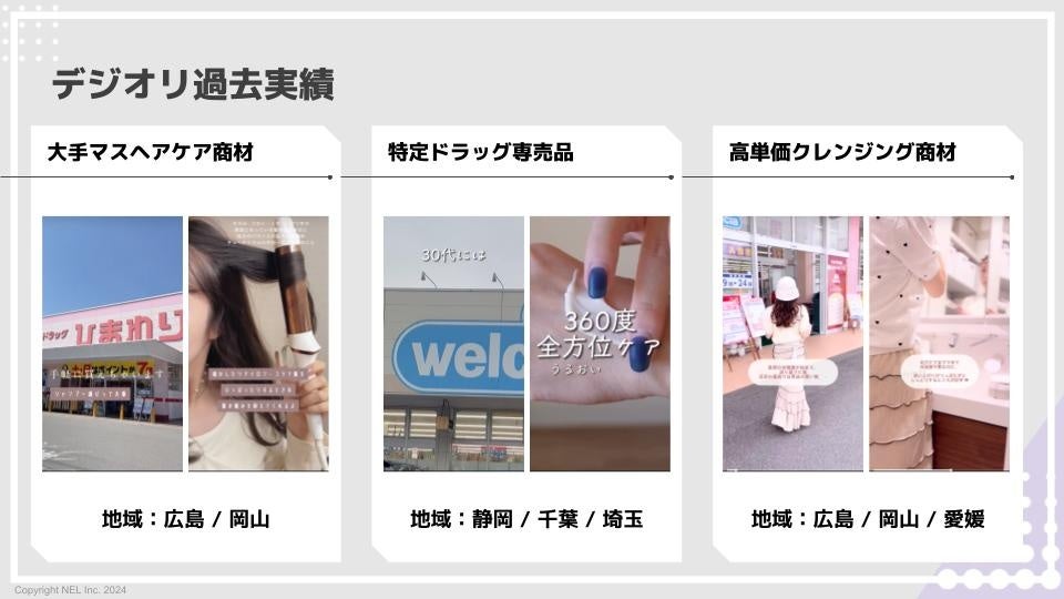 NELが保有する全国各地の地元クリエイターネットワークとリテール特化のプロモーション支援のノウハウを活かし、各商圏在住クリエイターによる来店動画を作成し、注力地域のユーザーへ共感性の高いコンテンツを多数リーチさせることでデジタル上で地域密着の広告施策が可能になります。