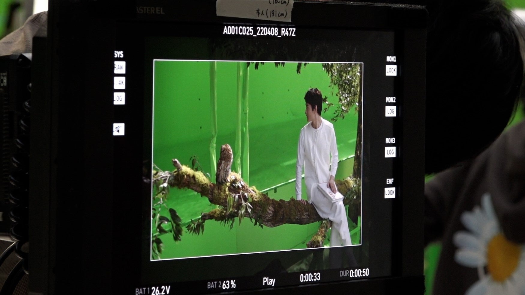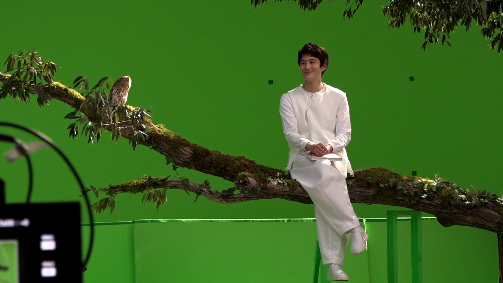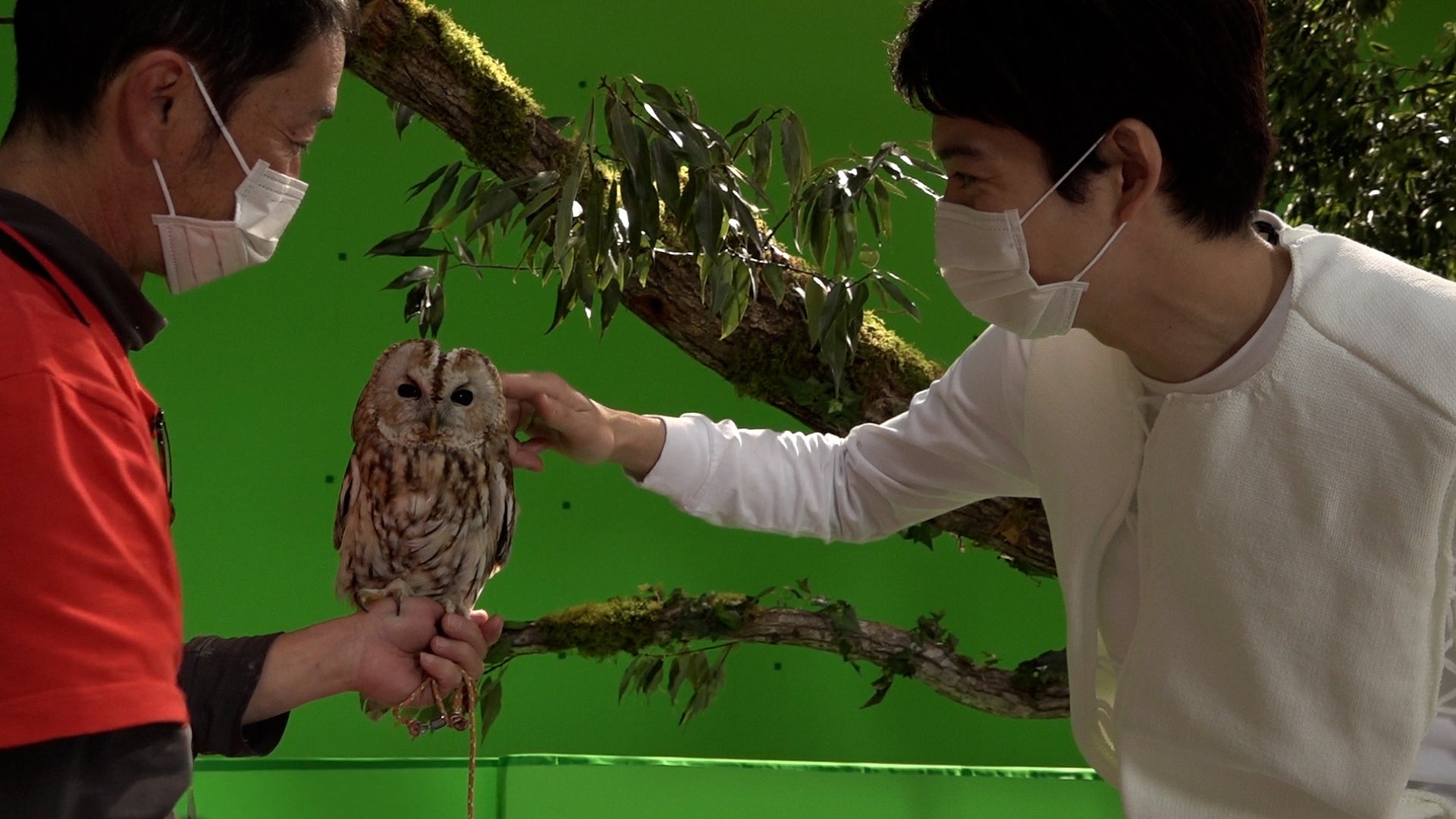 今回、岡田さんと共演いただいたフクロウは、モリフクロウの「まるちゃん」。森の賢者の名に相応しく、常に大人しく木の枝に鎮座し、トレーナーさんの指示で首を左右に動かしたり、必要な時だけ鳴き声を発したりと撮影はスムーズに進行しました。岡田さんと同時に振り返るシーンでは見事に息ぴったりで、その名演技に歓声があがることも。撮影の前から「会うのが楽しみ」と仰っていた岡田さんも、頭を撫でたりしながら、その可愛さに癒されたそうです。