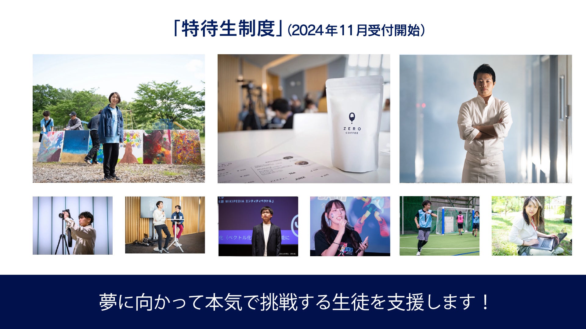 ゼロ高は「将来の夢なんか、いま叶えろ。」を掲げ、高校生起業家の育成や、国内外で活躍する次世代リーダーの輩出に力を注いできました。このたびの「特待生制度」により、学業や特定の分野で優れた実績を持つ生徒が、ゼロ高での学びを通して自らの可能性を最大限に引き出せるよう支援してまいります。