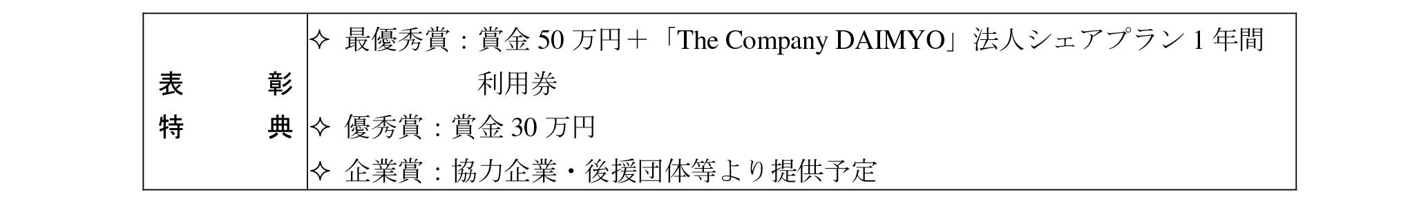 3回目となる今回は、「Well-beingとSustainability ~こころ豊かな暮らしと持続可能な社会に向けて~」をコンセプトとしたさまざまなビジネスアイデアをアナログ・デジタル問わず募集し、 最優秀賞の表彰特典として賞金50万円のほか「The Company DAIMYO」法人シェアプラン1年間利用券を提供します。