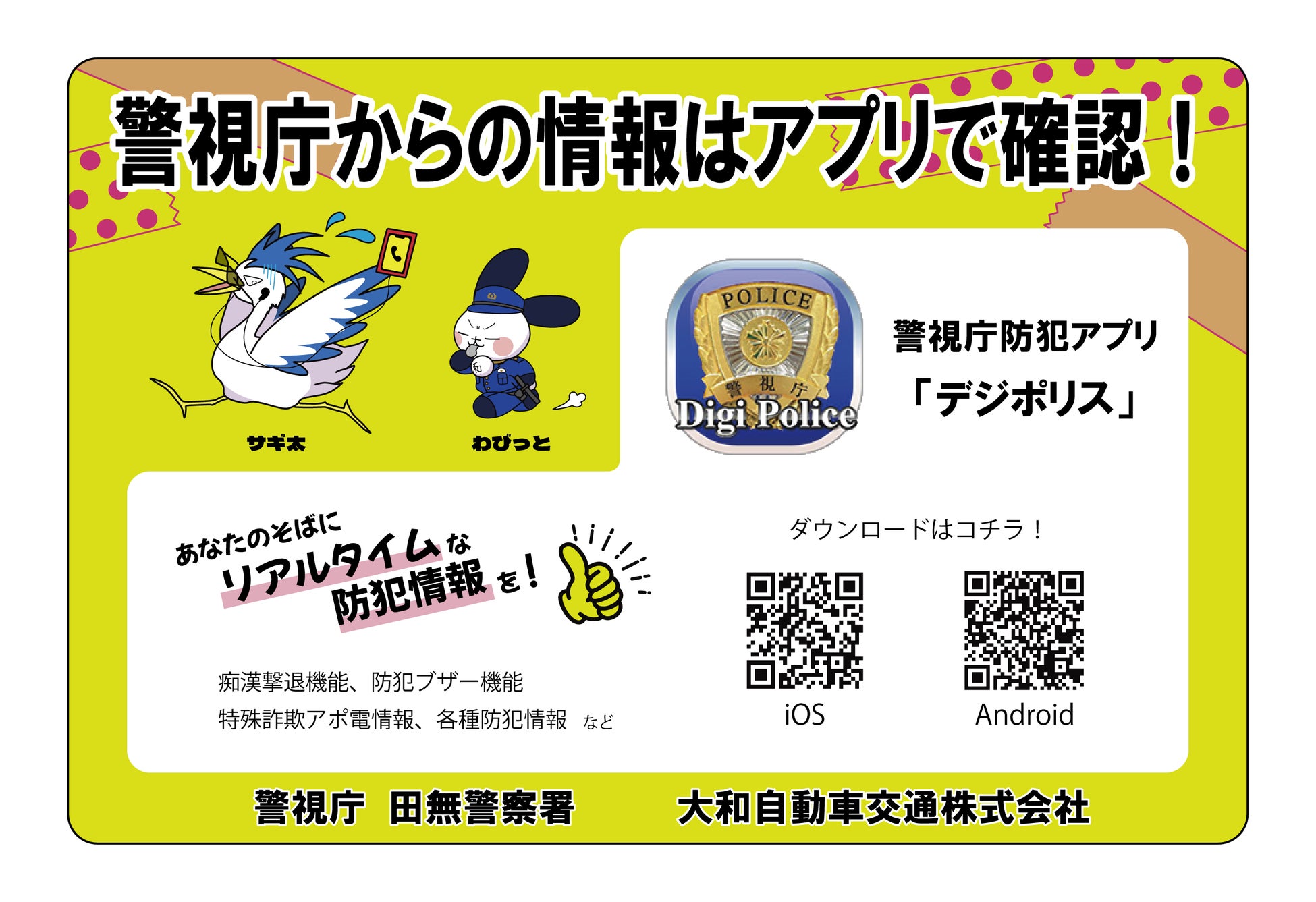 車内には、警視庁公式防犯アプリ「Digi Police(デジポリス)」の利用を促す