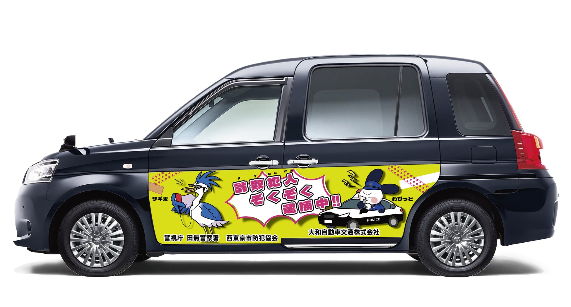 本取り組みは、地域の皆さまに向けて特殊詐欺への注意喚起を促すことを目的としたもので、警察や 防犯協会と連携した啓発活動の一環です。車体には、詐欺の犯人に扮したキャラクター「サギ太」と、 警察官に扮した「わびっと」のイラストを施し、あわせて「詐欺犯人ぞくぞく逮捕中!!」といった防犯意識を高めるメッセージを掲出しています。これらのキャラクターは、田無署の署員と大和自動車交通の職員が協力してデザインしたものです。また、車内には警視庁公式防犯アプリ「Digi Police(デジポリス)」の利用を促すステッカー広告も掲出し、ご乗車いただいたお客様にも防犯意識の向上を図っています。地域を日々走行するタクシーを通じて、さまざまな場所で防犯メッセージを届け、市民の皆さまへの注意喚起につなげてまいります。