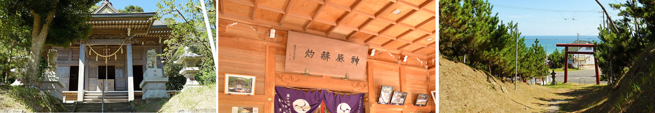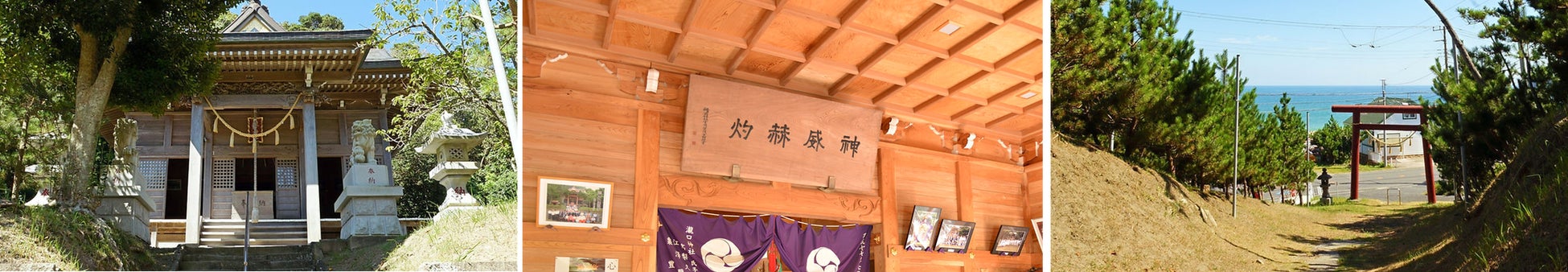 延暦元年(西暦782年)に創建された勝浦市部原に鎮座する海を望む神社で、境内は波の音が清々しく聞こえます。御神域の明神根はサーフスポットとして、サーフィンをされる方で賑わっています。