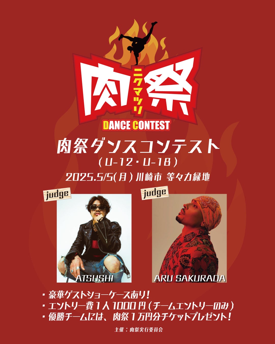 特設ステージにて、ダンスキッズのための特別企画『肉祭ダンスコンテスト2025』が”こどもの日”5月5日(月・祝)に開催決定!ダンスが大好きなキッズたちの熱いパフォーマンスが、お肉の香り漂う会場をさらに盛り上げます!今回のコンテストは、U-12部門・U-18部門の2カテゴリー制で実施。ゲストジャッジには、King&Princeの振付も手がけるATSUSHIと、今大注目のダンサーARU SAKURADAの2名が登場!