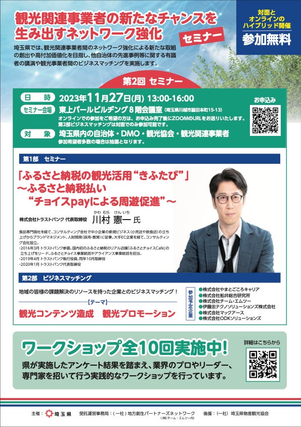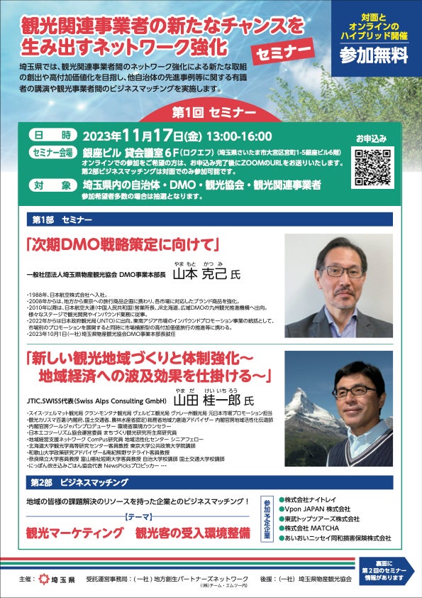 11月開催の埼玉県観光セミナー、山田 桂一郎氏と川村 憲一氏の登壇が決定