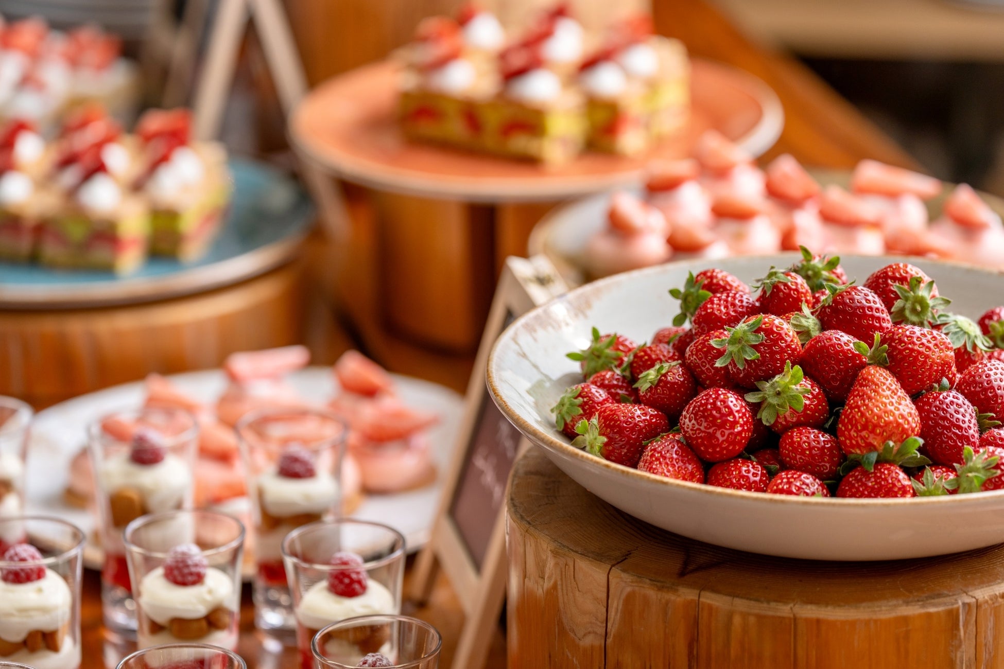 ブッフェのスターターとして、プレートでお持ちします。つややかに輝く極上の完熟苺をお召し上がりください