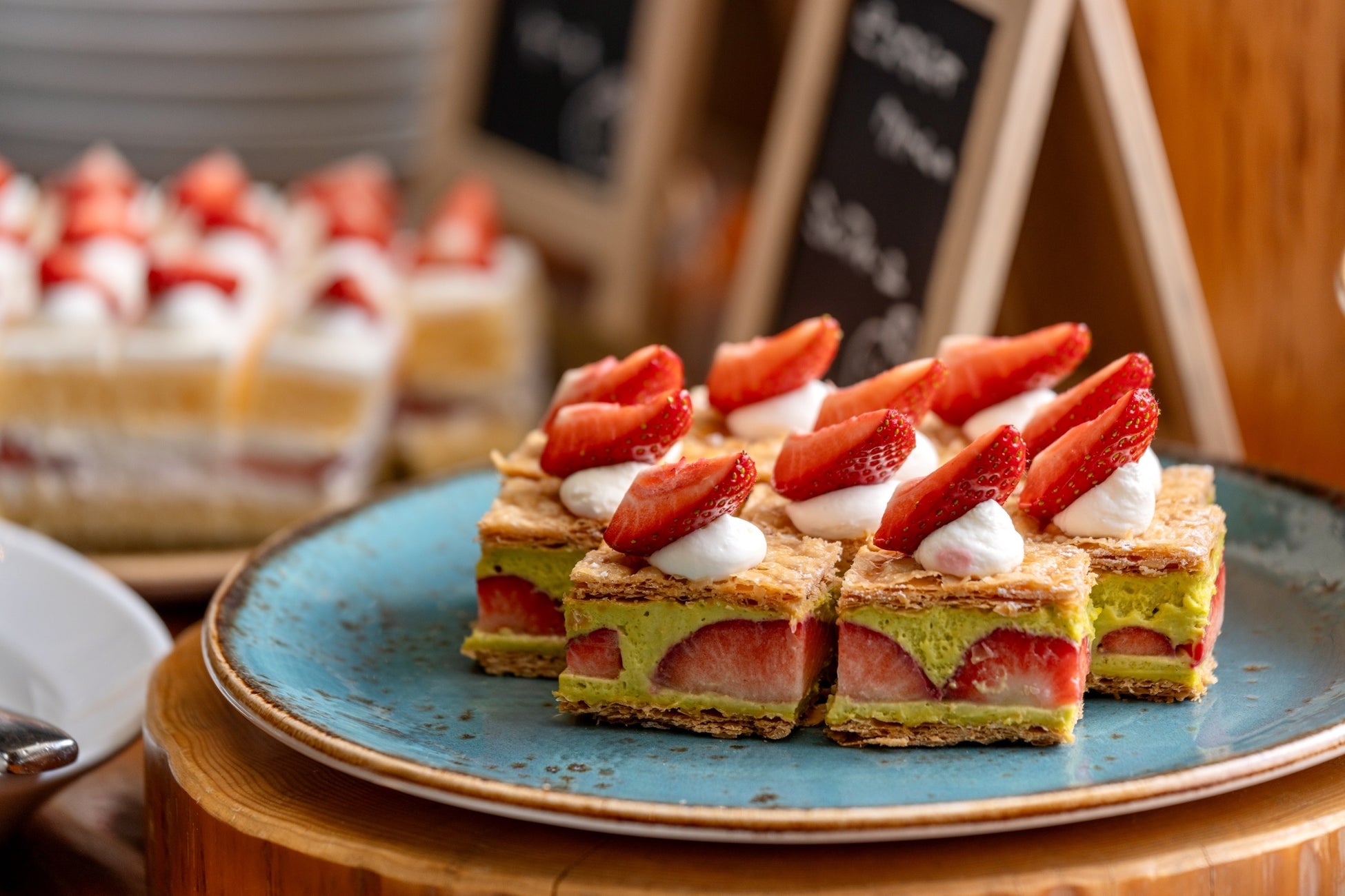 ブッフェ台に並ぶのは個性豊かな苺スイーツ。“京の雫”の特徴を生かし、苺の酸味や甘みに合うデザートをペストリーチームが一つ一つ丁寧に作り上げました。ジューシーな苺の甘みが口いっぱいに広がるタルトや、定番のショートケーキ、濃厚な味わいのクリームチーズケーキやピスタチオのミルフィーユなどをご用意します。イチゴのライブステーションでは、苺のクレープが登場し、シェフが注文をお受けしてお作りします。