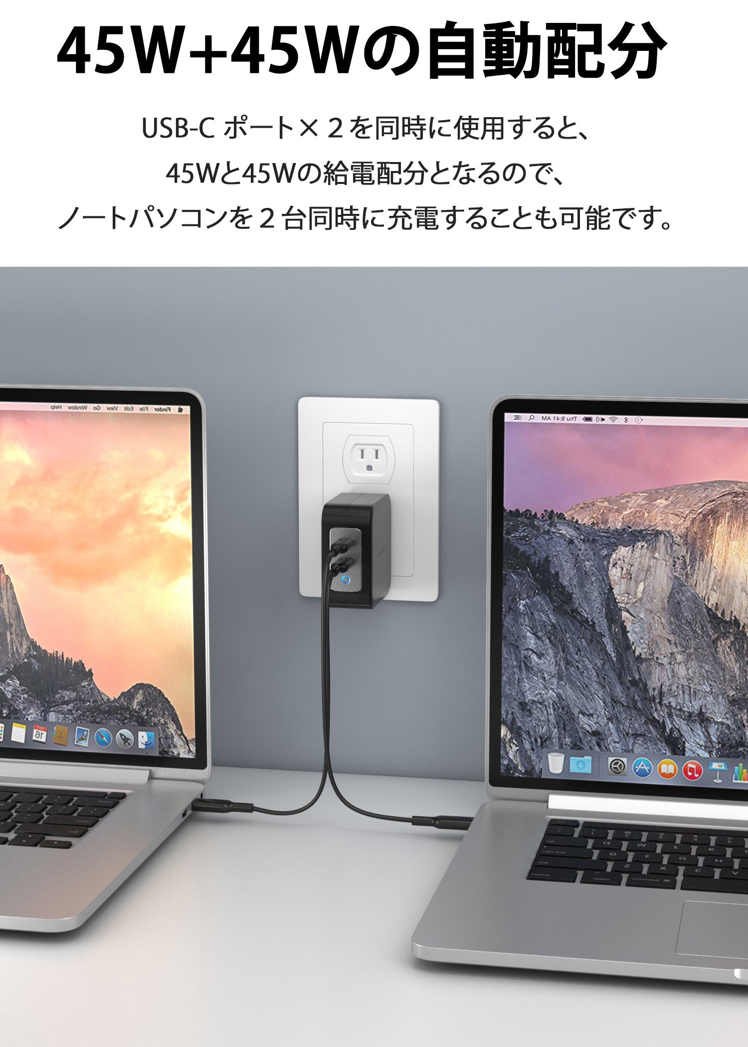 合計最大90Wの高出力でノートPCをPD45W+PD45W 2台同時に急速充電できます。利用機器毎に異なる充電器を持ち運ぶ必要はありません。