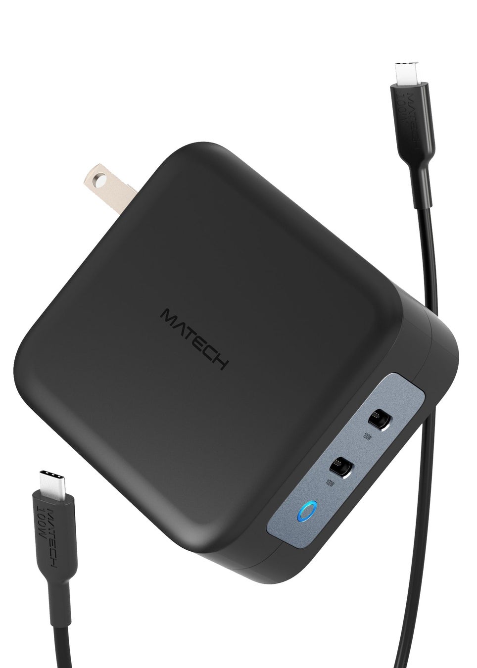 次世代USB急速充電器「MATECH Sonicharge 100W」は、「パワフルさ」と「圧倒的なポータブル」を実現しました。次世代パワー半導体「GaN」を採用し、Power Delivery 3.0を搭載した単ポート最大100W出力のUSB Type-Cポート(以下Type-C)2つを1つの充電器で出力が可能です。Type-C 2ポートは同時出力合計でPD45W + PD45W 最大90Wのパワフルな出力が可能な上、ほとんど全てのUSB機器に最適な速度でフルスピード充電できるため、複数のモバイル機器を毎日使いこなしている方に最適です。