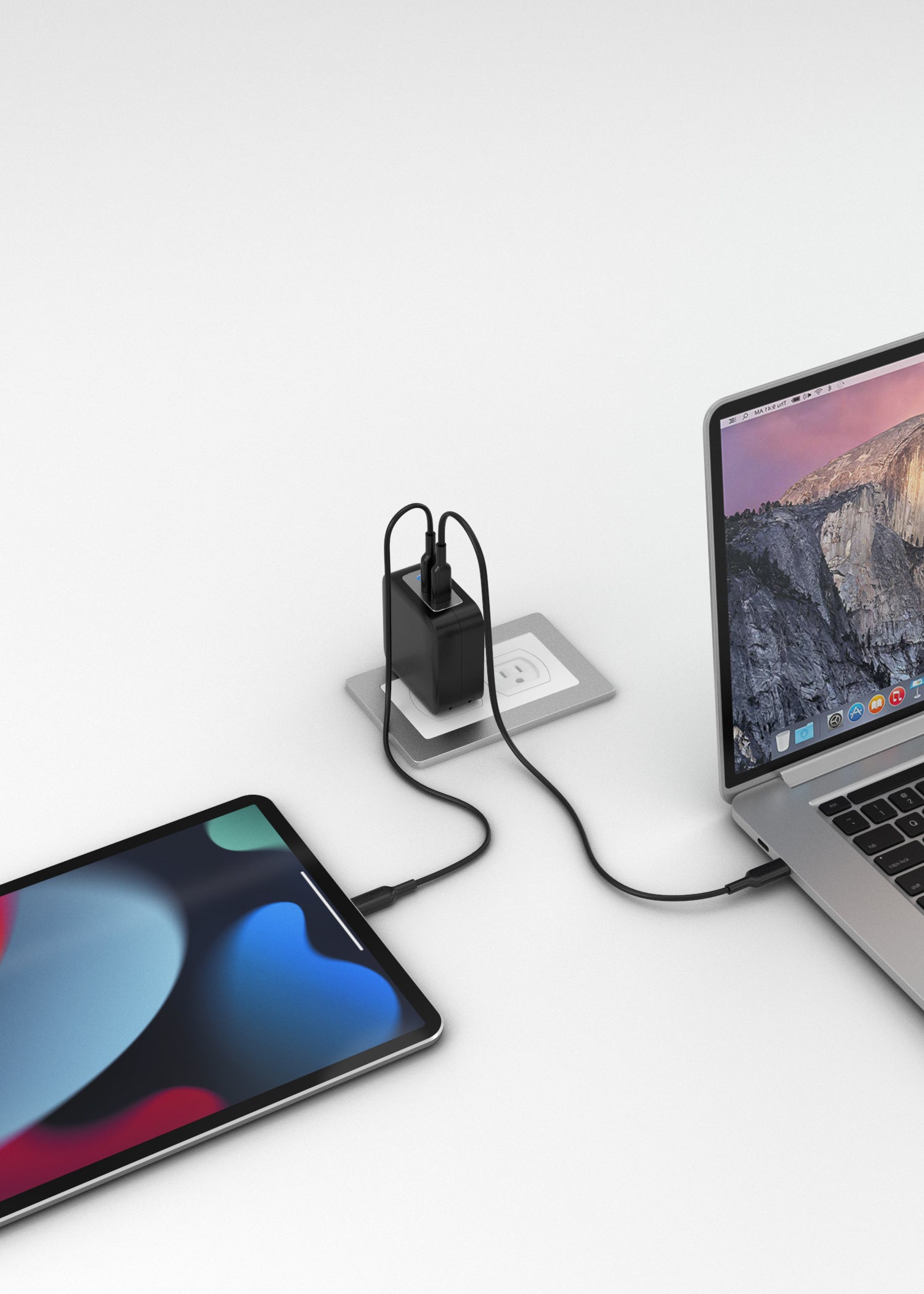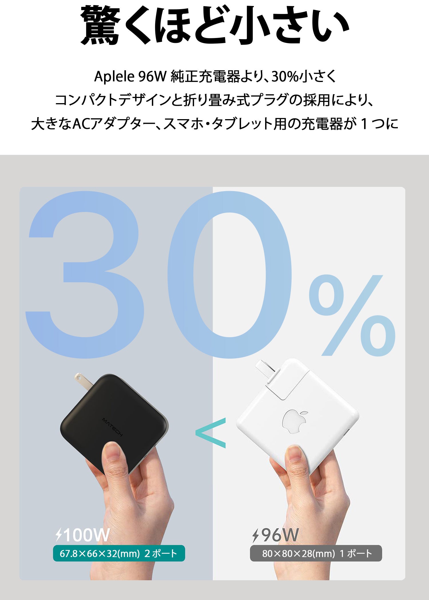 Apple 96W 純正充電器より、30%小さくコンパクトデザインと折り畳み式プラグの採用により、大きさACアダプター、スマホ・タブレット用の充電器が1つになりました。